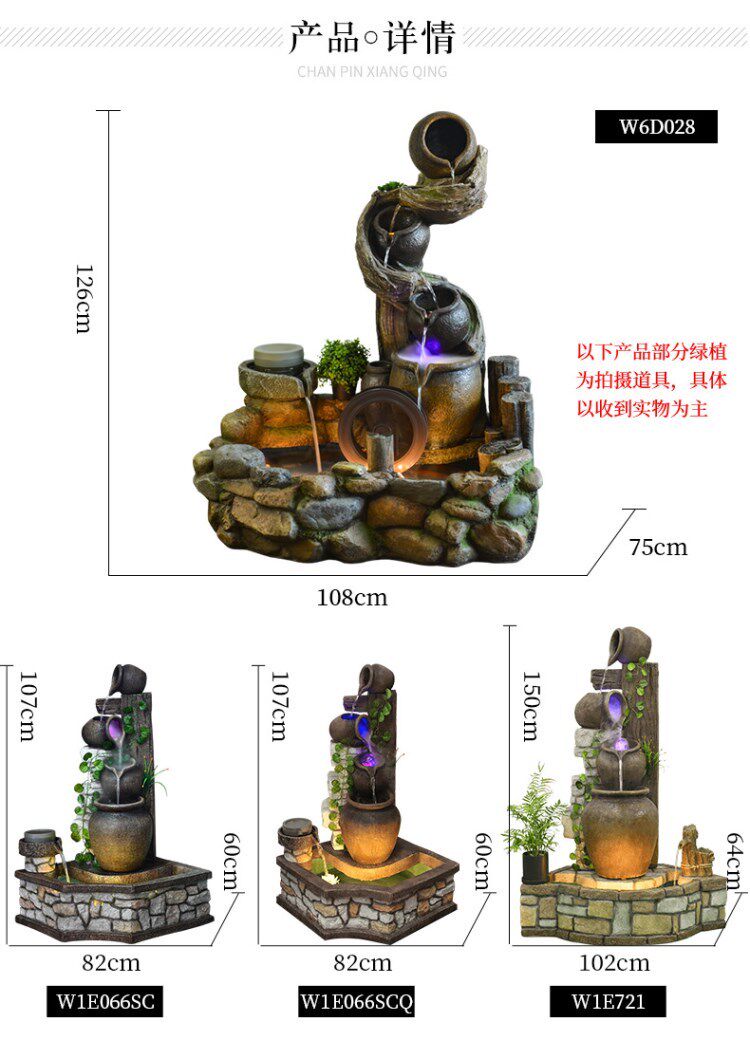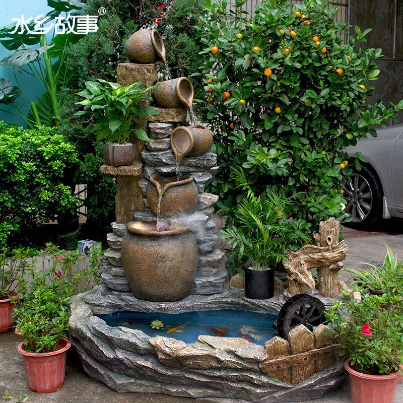 Циркуляция воды, украшения, украшение виллы, двор, пейзаж, терраса, садовый пол, каменистый фонтан, пруд с рыбой, двор