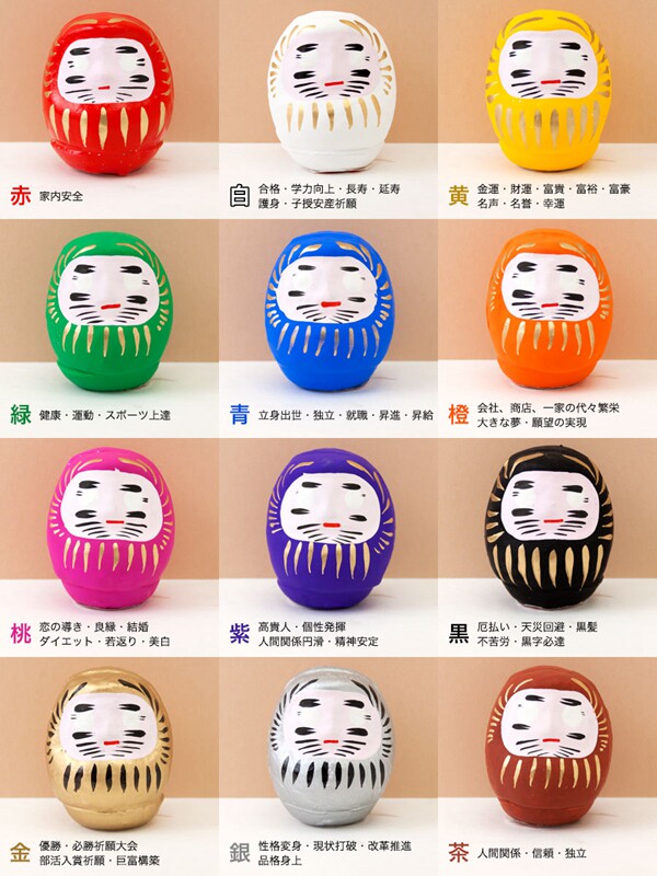 | Цвет: | Красная дарума, Персик だるま, Белый / だ㋾, Фиолетовый だるま, Черный だるま, Хуанг, Золото だるま, Зеленый だ㋾, Серебро だ㋾, Синий дарума, Чай だるま, Оранжевый だるま |
