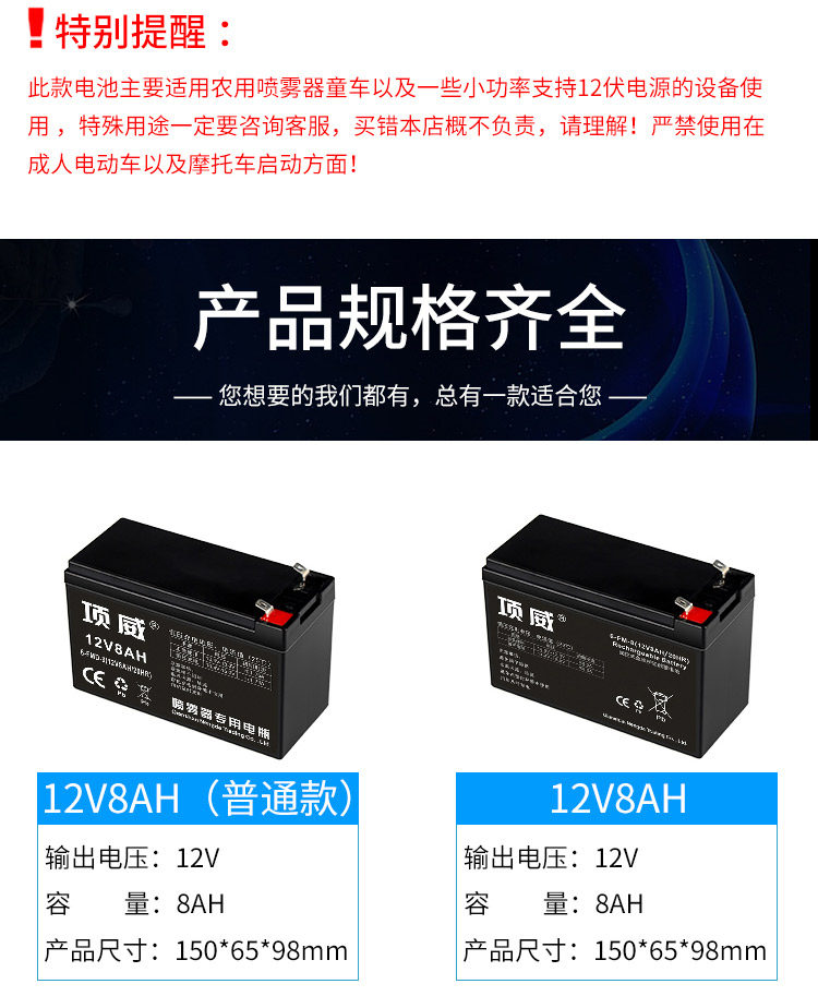 Инструкции по покупке: обычная батарея 12V8AH подходит только для опрыскивателей и детской коляски. Пожалуйста, проконсультируйтесь с обслуживанием клиентов в специальных целях. Вы не несете ответственности за неправильную покупку. Кроме того, обычная модель является рекламной моделью с трехмесячной гарантией. Спасибо за понимание и поддержку!
