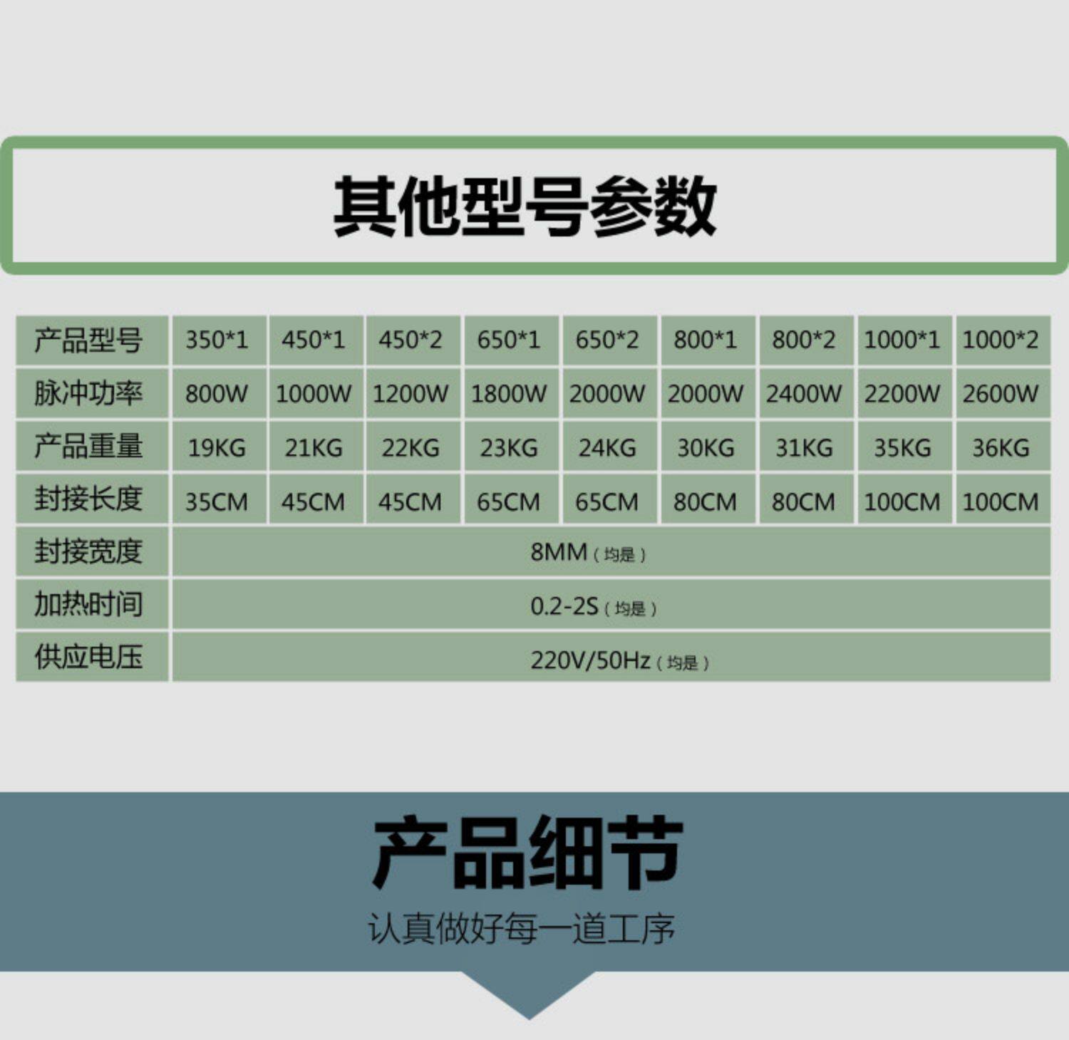 | Цвет: | 350*1 Одиночное нагревание длины уплотнения 350 мм, 350*2 двойной нагрев 350 мм длина уплотнения, 450*1 Одиночное нагревание 450 мм длина уплотнения, 450*2 двойной нагрев 450 -мм уплотнения, 650*1 Одиночный нагрев 650 мм, 650*2 двойной нагрев 650 -мм уплотнения, 800*1 Одиночное нагревание длины 800 мм уплотнения, 800*2 двойной нагрев 800 -мм уплотнения, 1000*1 однопогрев 1000 -мм уплотнения, 1000*2 двойной нагрев 1000 -мм уплотнения, Еще один+450 юаней может быть заменен пневматическим типом, Добавить еще 300 с помощью кодирующей машины |
