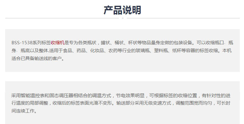 Машина Label Shiping Series BSS-1538-это упаковочное оборудование, адаптированное различными видами бутылочных, в форме бака, бочек, чашкообразных предметов.Он может уменьшить рот бутылки, кузов бутылки, дно бутылки и в целом. Он подходит для этикетки стеклянной бутылки, пластиковой бутылки, бумажной чашки и других контейнеров в продуктах, лекарствах, косметике, пестицидах и других отраслях промышленности.Эта машина подходит для клиентов, у которых уже есть линия передачи.