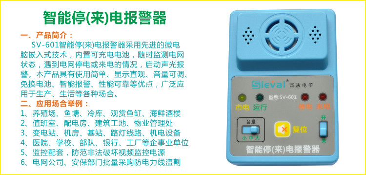 Интеллектуальная сигнализация отключения электроэнергии (входящего) SV-601 использует передовую встроенную микрокомпьютерную технологию и имеет встроенную перезаряжаемую батарею для мониторинга состояния электросети в любое время. При отключении электроэнергии или входящем звонке он активирует звуковой и визуальный сигнал тревоги.Этот продукт имеет такие преимущества, как простое использование, интуитивно понятный дисплей, регулируемая громкость, отсутствие замены батареи, интеллектуальная сигнализация и надежная работа. Он широко используется в различных случаях, таких как производство и жизнь.