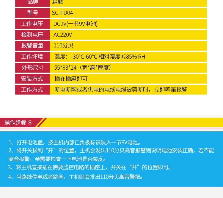 Основные функции:Обычно вставляется в гнездо. После того, как будет выпущена суперпократическая тревога, такая как авария, такая как сбой питания, отключение питания и тройные звуки Superpocel Superpocel 120 Decibel. Он не будет звучать до тех пор, пока переключатель тревоги не будет выключен или восстановит источник питания.