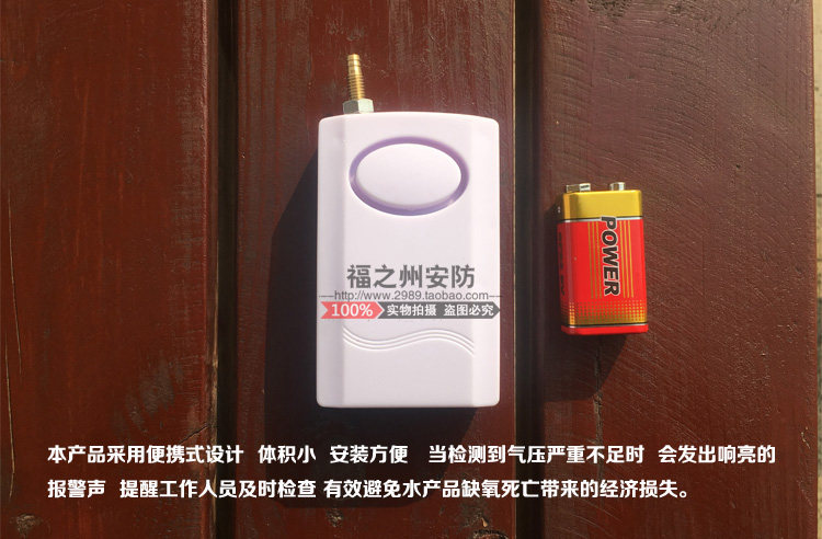 Этот продукт использует портативную конструкцию с небольшим размером и удобной установкой. Батарея 9 В может использоваться в течение полугода. Когда давление воздуха будет обнаружено, будет сделана громкая тревога, чтобы напомнить персоналу, чтобы проверить.Он подходит для аквакультурных ферм и особенно подходит для транспортных транспортных средств. Смерть водных продуктов.
