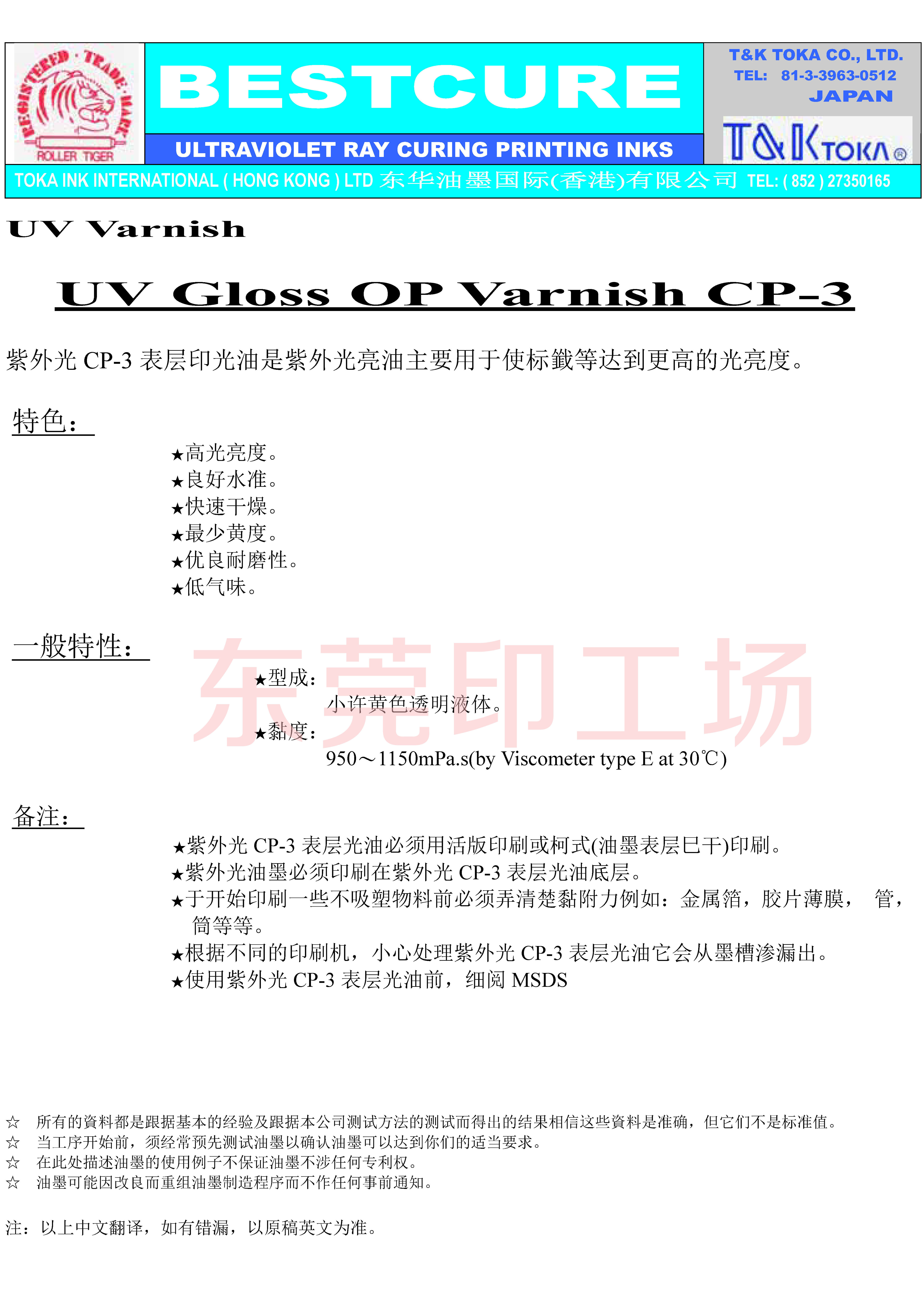 Оригинальная японская тока-клей тигровые чернила ультрафиолетовое отверждение CP-3 Оптическое масло Высокое блеск с низким желтым и низким содержанием запаха