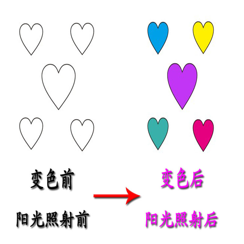 Цветовая продукция -это продукт, который производит изменения цвета после солнечного света или ультрафиолетовых лучей. При потере солнечного света или ультрафиолетовых лучей он вернется обратно к исходному цвету.Этот продукт красочный, зеленый и экологически чистый.