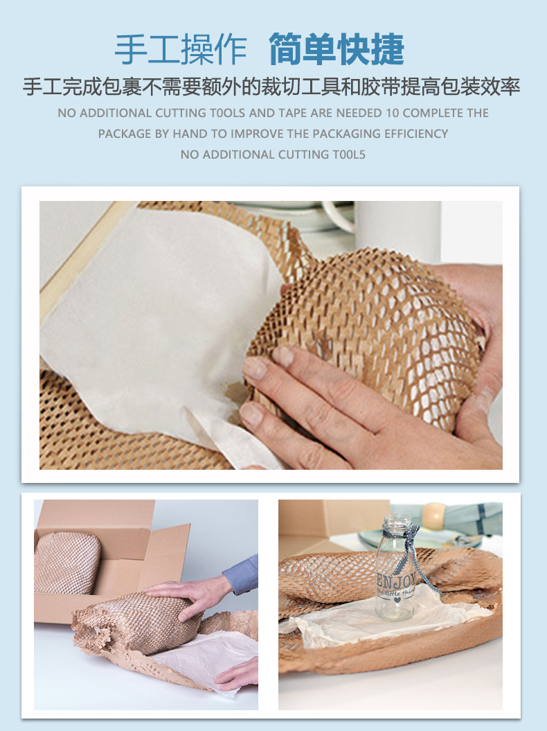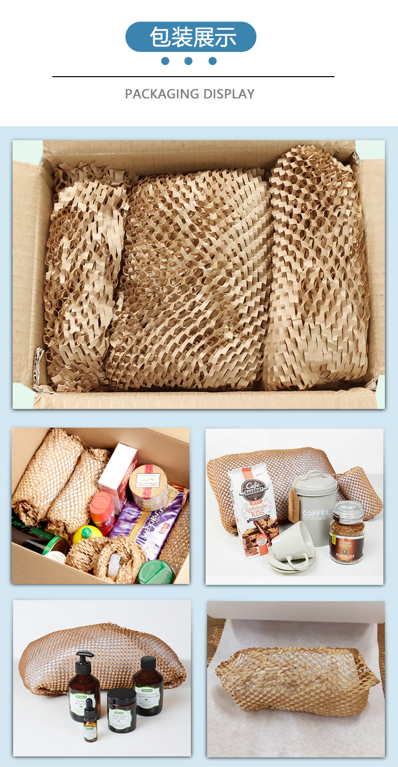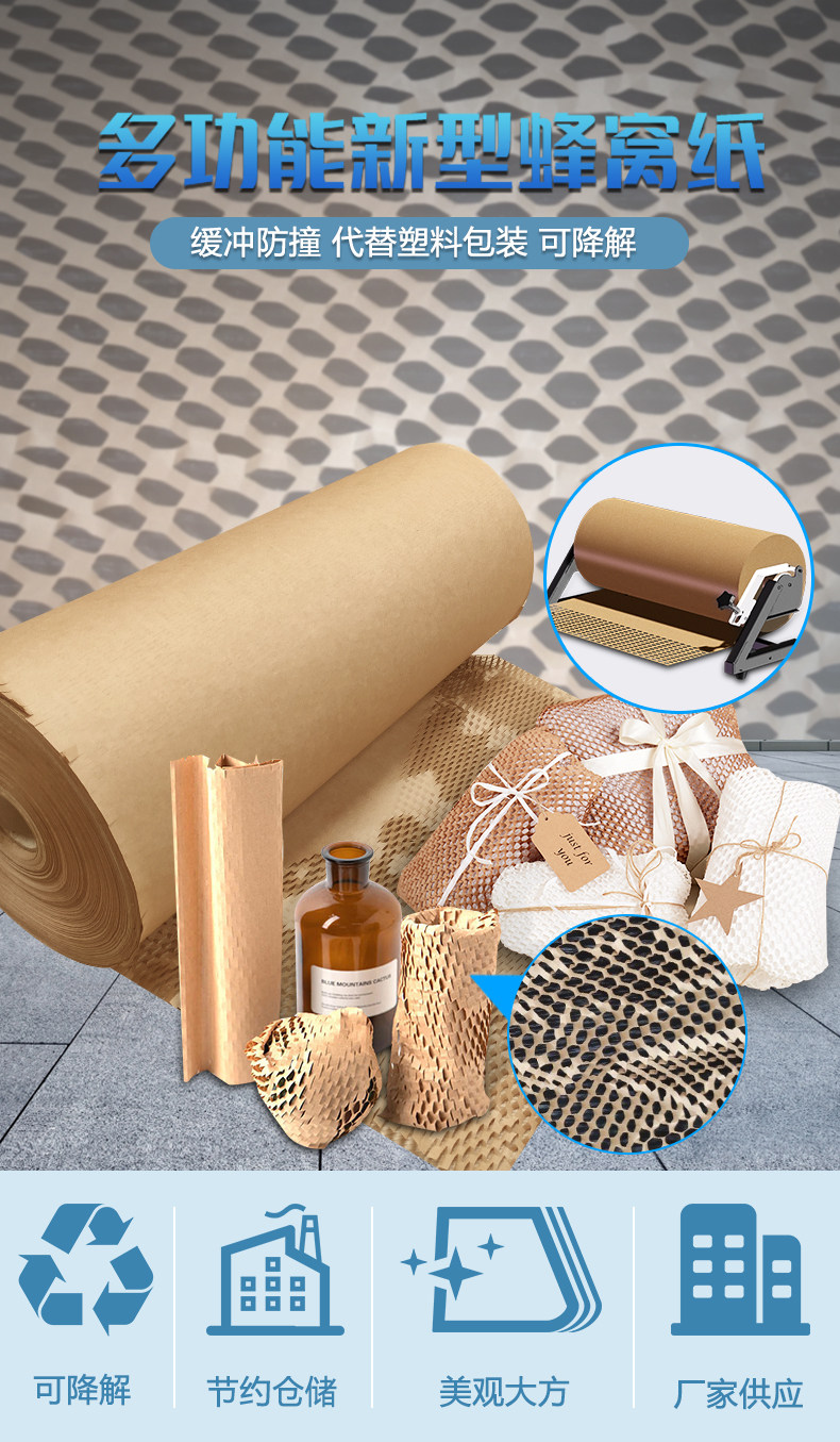 Кожаная бумага Honeycomb - это новый экологически чистый упаковочный материал, который может заменить пластиковые упаковочные материалы, такие как традиционная пузырьковая пленка.