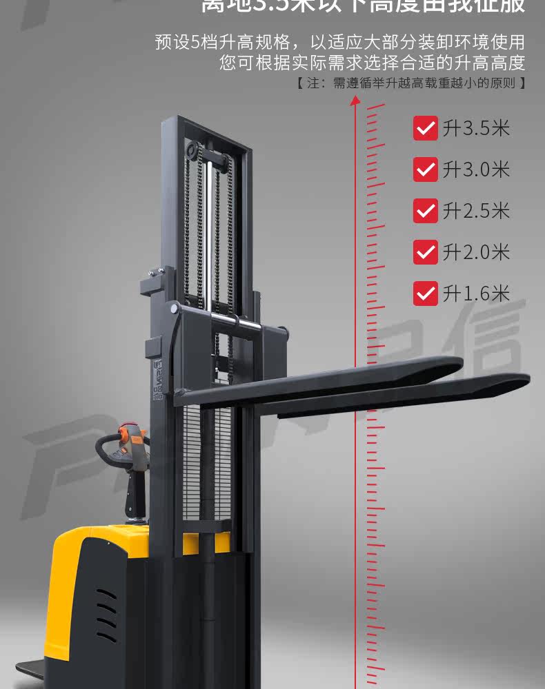 Форкзалик Полный электрический гидравлический стек Высокая станция, проезжая 2 тонны транспортных транспортных средств, поднятые транспортны