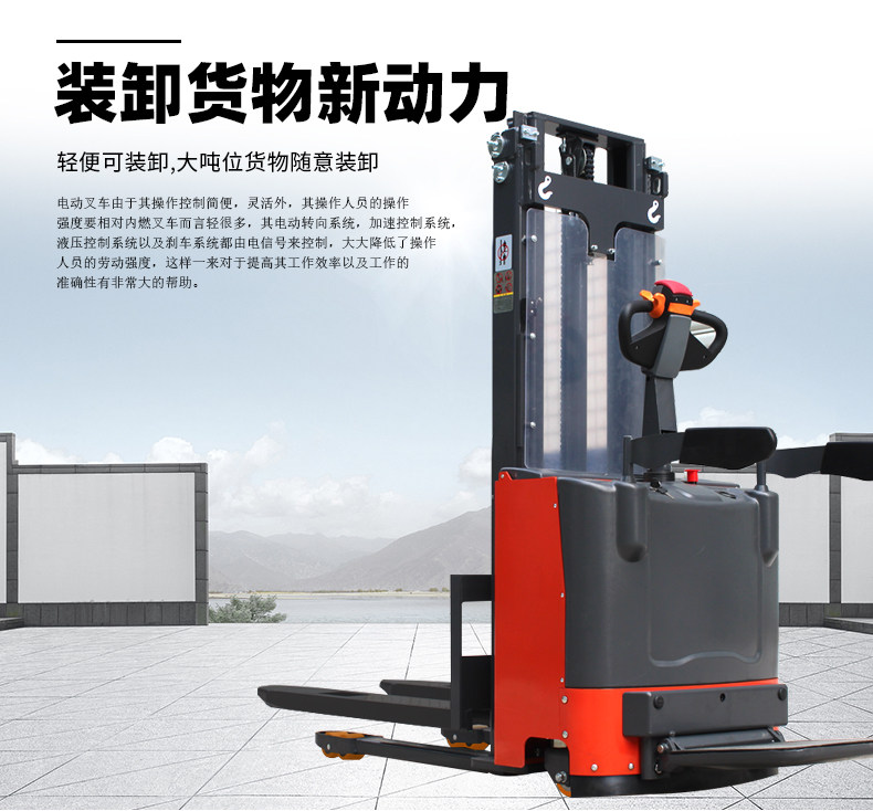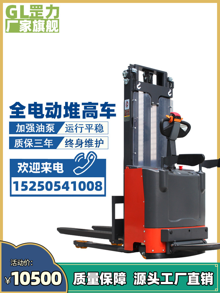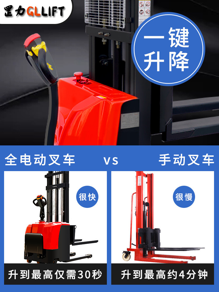 罡力 Полный электрический вилочный погрузчик 1 тонна, 2 -минутный маленький гидравлический укладчик с высоким транспортным средством, повышенное подъем, вилочный погрузчик