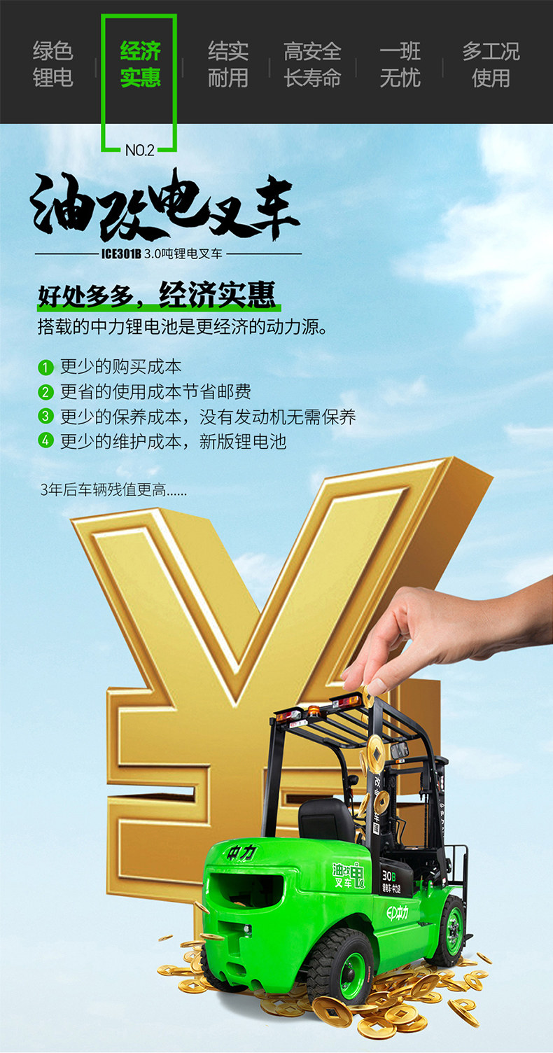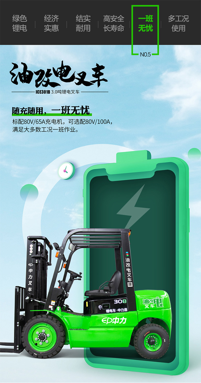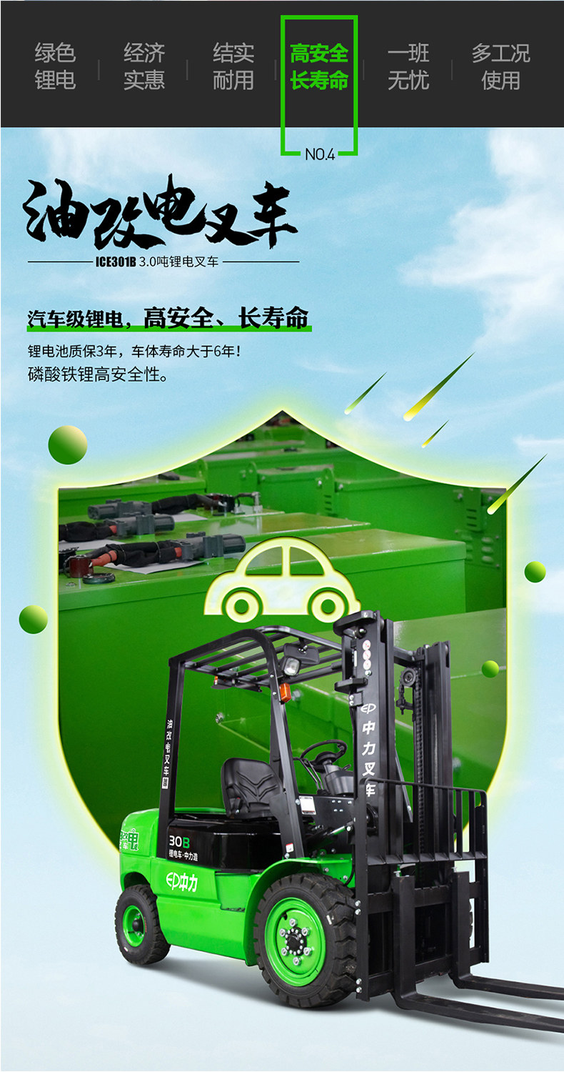 Zhongli 3,0 тонны электрической вилочной литиевой аккумуляторной батареи с высокой точкой батареи.