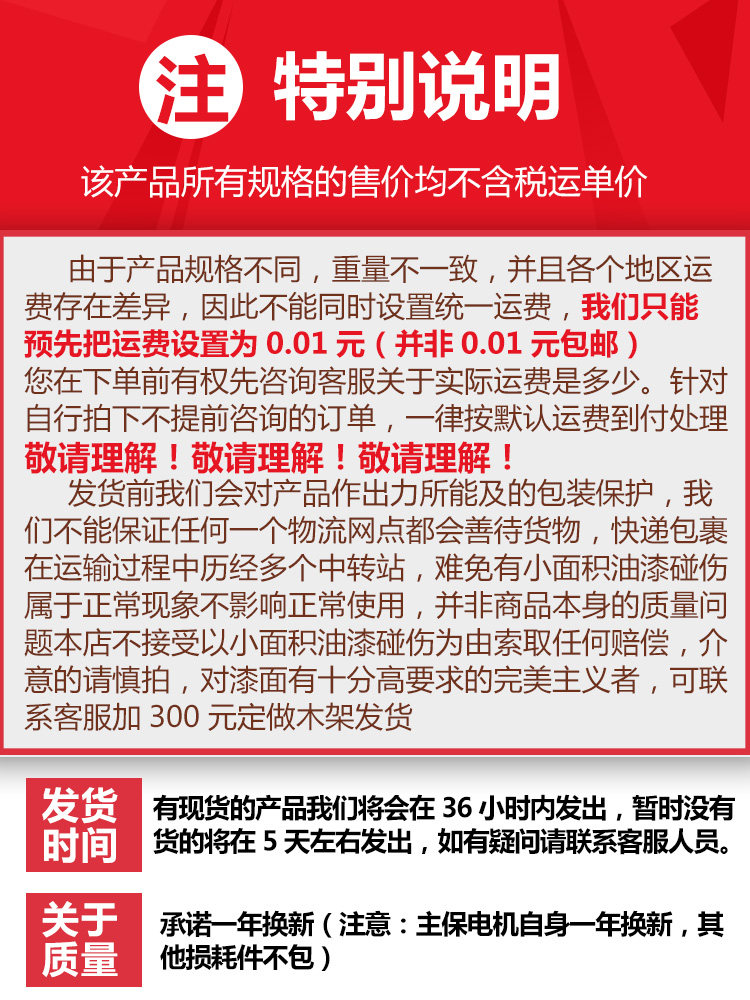 1. Из -за различных технических характеристик проката, вес не соответствует, и существуют различия в грузах в различных регионах. Фактический груз перед размещением заказа.Пожалуйста пойми!(Предварительные настройки по умолчанию составляют 0,01 юань или бесплатная доставка, отображаемая во время мероприятия по продвижению Taobao, не является фактической ценой груза.) Пожалуйста, свяжитесь с обслуживанием клиентов, чтобы составить цену, потому что прибыль ограничена.