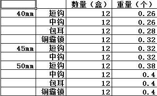 | Цвет: | 40 -миллиметровый короткий крючок, 40 мм цент блокировки, 40 -миллиметровые уши, 45 -миллиметровый короткий крючок, 50 -миллиметровый короткий крючок, 50 мм цента блокировки |