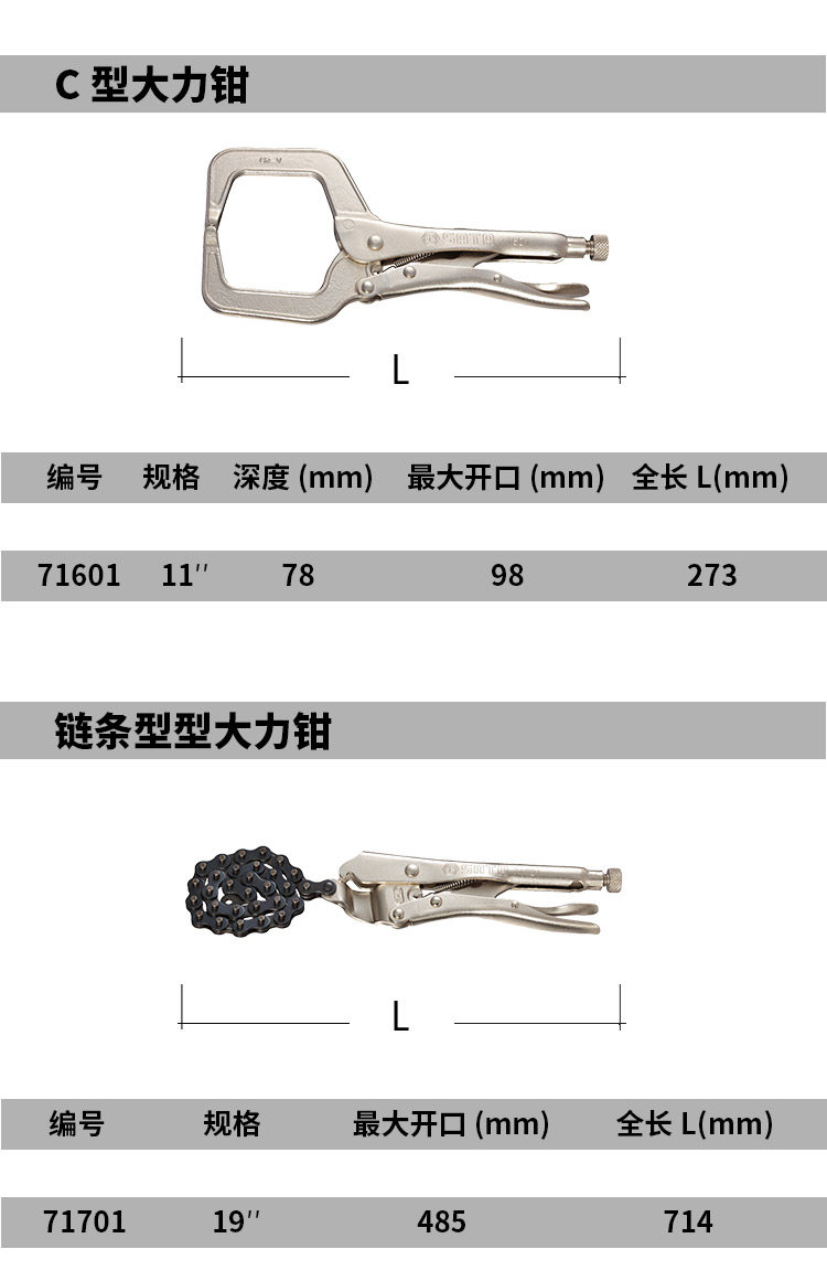 | Цвет: | 71401/Щипцы сварочные мощные 9", 71501/Щипцы железные 8 дюймов, 71601/c тип типа Big Force Clamp 11 '', 71701/глава Power Pliers 19 '' |