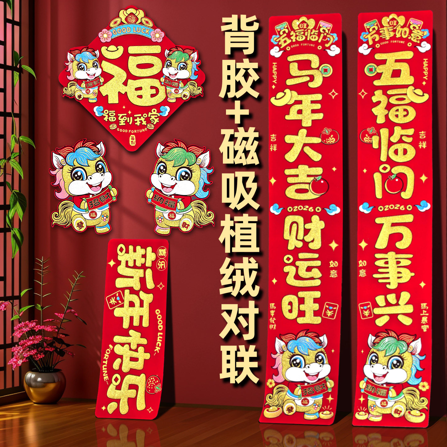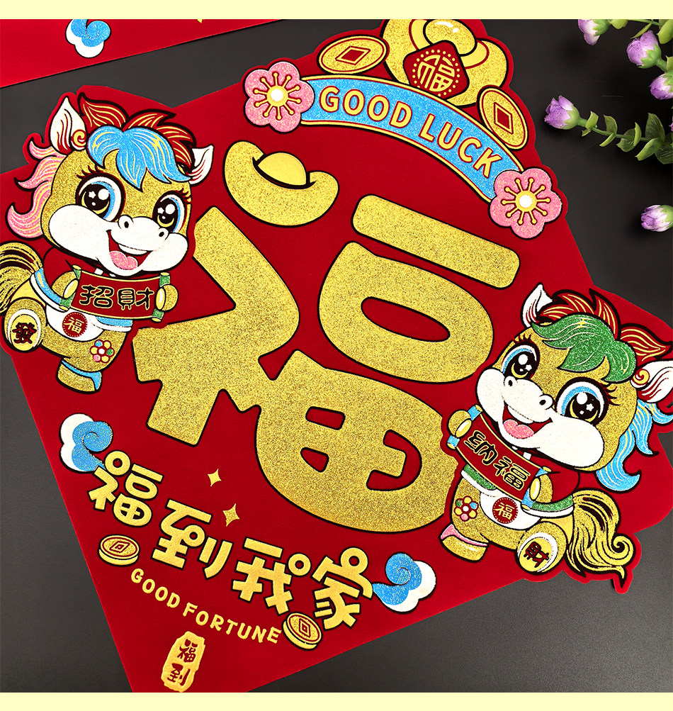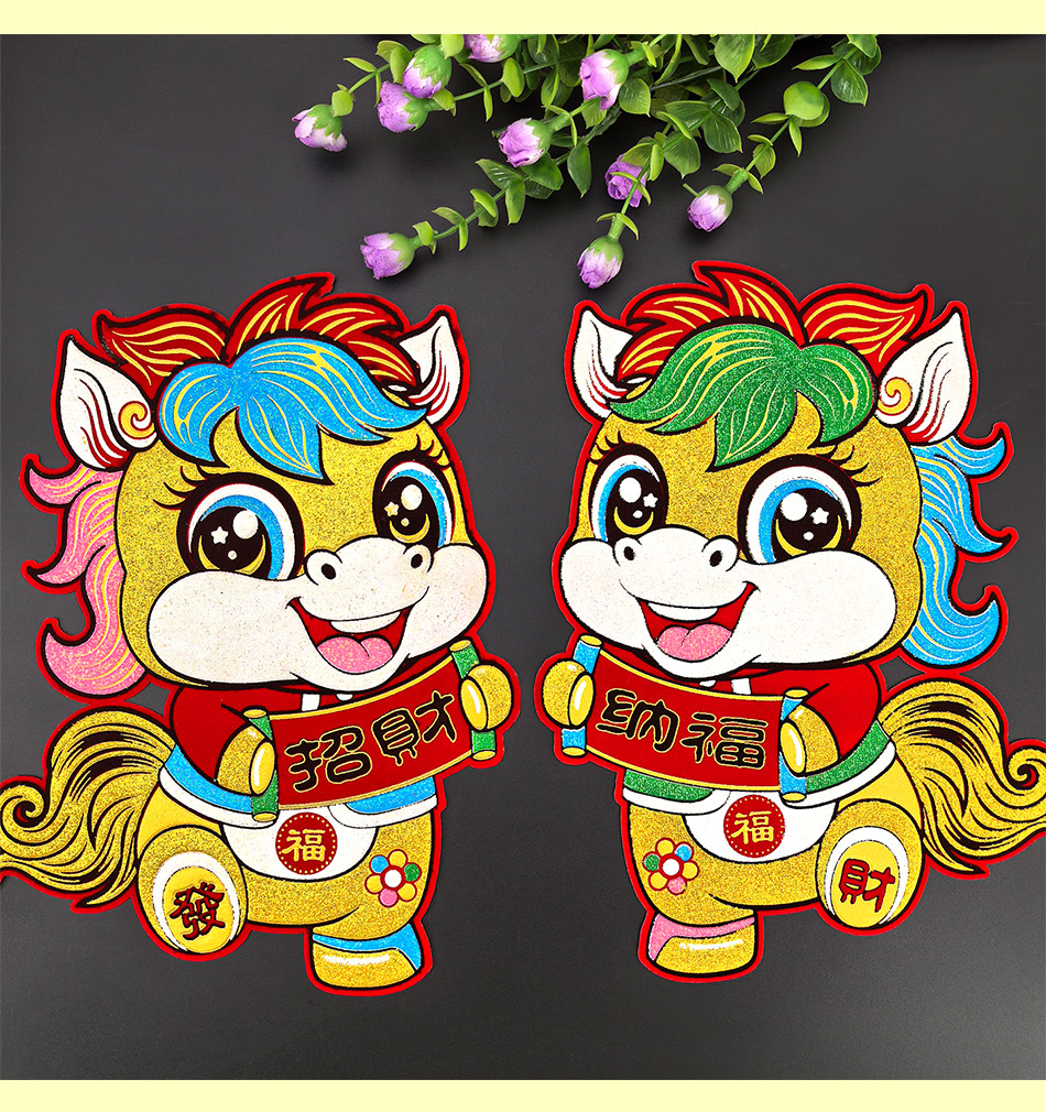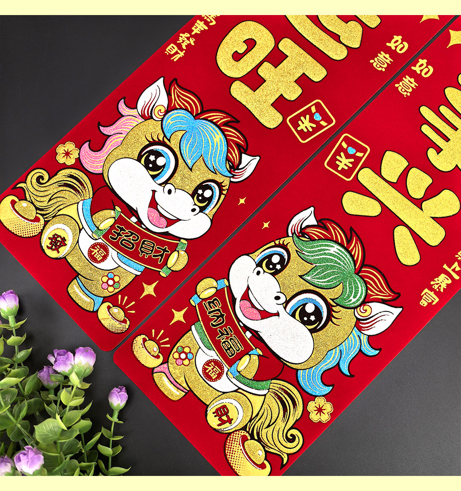 2026 Год Лошади Новый год Новый мультяшный флокированный материал Клей на полной основе Маленькие куплеты со словами удачи Дверные наклейки Зодиак Магнитные пружинные куплеты