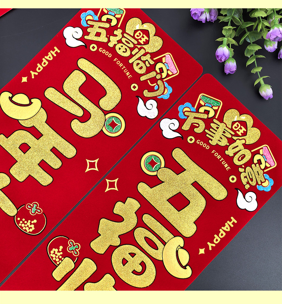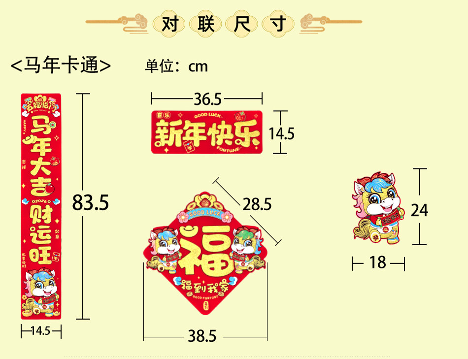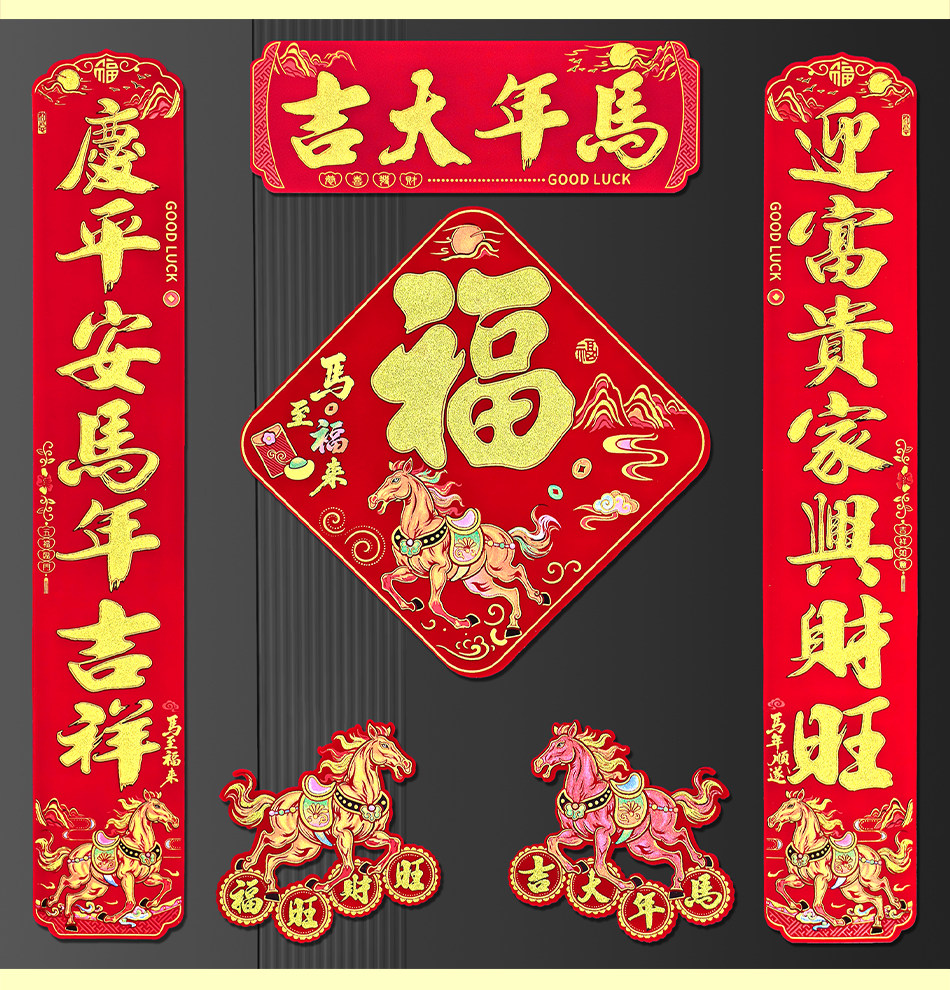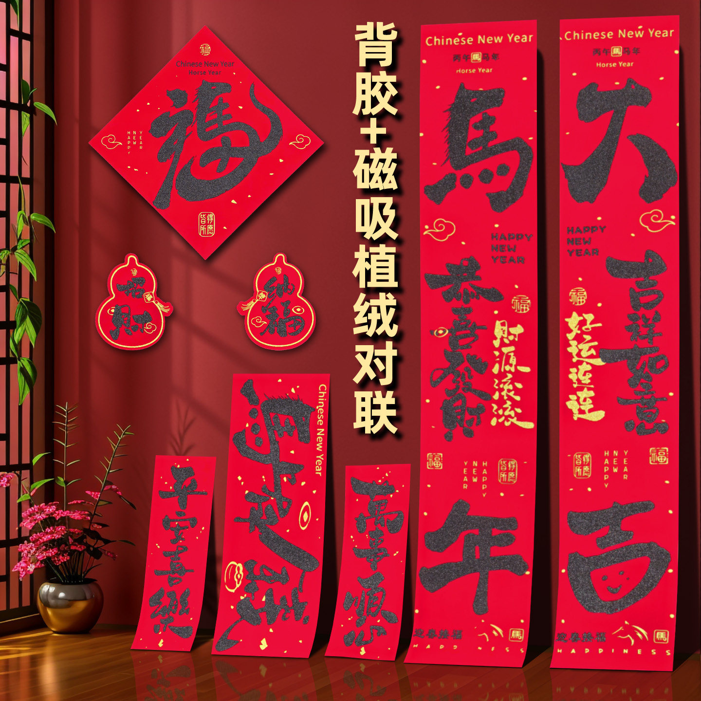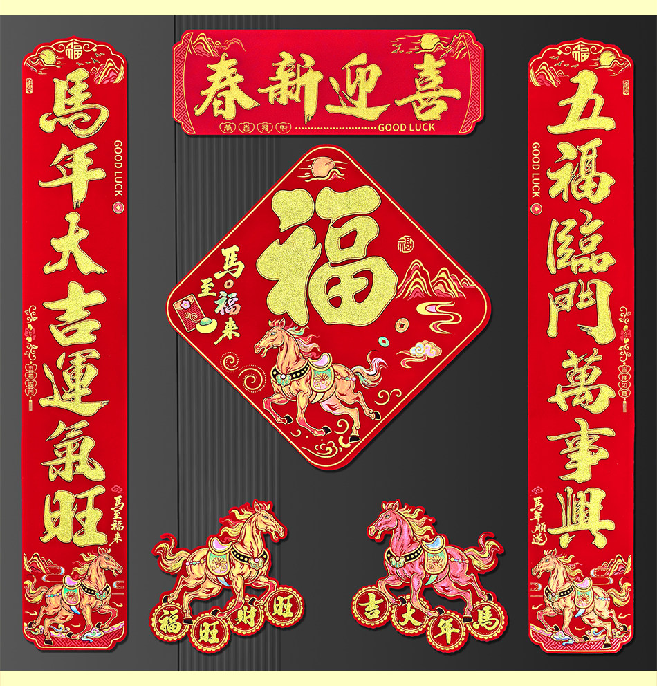 2026 Год Лошади Новый год Новый мультяшный флокированный материал Клей на полной основе Маленькие куплеты со словами удачи Дверные наклейки Зодиак Магнитные пружинные куплеты