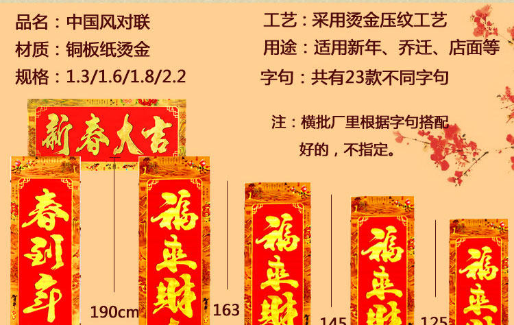 | Длина: | 1.3 Fortune Fangli (высота 125 см), 1.3 Весна, лето, осенний и зимний сезон (высокий 125 см), 1.3 Новый семейный праздничный весенний фестиваль до нового года (высокий 125 см), 1.3 PING Значение двух слов (высота 125 см), 1.6 Основатель -основатель (высота 145 см), 1.6 Открытие двери Dajiyu Caiyuan (High 145 см), 1.8 Baifu Linmen Family Real Estate (высота 163 см), 1,8 человек Шунцзия и шедевр (высокий 163 см), 1.8 СЕМЬИ Юн'ан Кан (высокий 163 см), 1,8 Старшая фотография (высокая 163 см), 22 000 вещей, как удача (высокая высота 190 см), 2.2 Весенняя земля Цветок Цветок (высота 190 см), 2.2 Человечество и пожелания (высокий 190 см), 2.2 Fortune Lush для Санцзяна (высокий 190 см) |