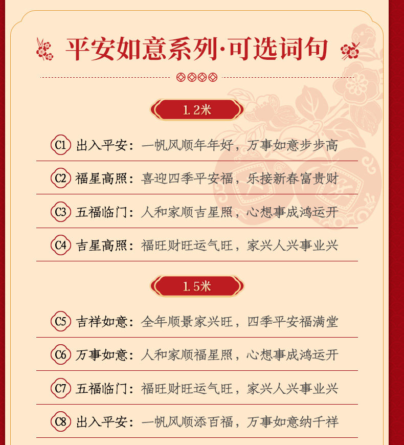 | Цвет: | A1. Fuxing Gao Zhao-1,2 метра, A2, A3. Плавное плавание-1,2 метра, A4. Wufu Linmen-1,2 метра, A5. Wufu Linmen-1,5 метров, A6. Благословение золотых быков-1,5 метров, A7, A8. Плавное плавание-1,5 метра, A9. Новый год-день-1,8 метра, A10., A11. Wufu Linmen-1,8 метра, A12., A13. Телец Сянь Ру-2 метра, A14. Плавные парусные 2 метра, B1. Wufu Linmen-1,2 метра, B2. Плавное плавание-1,2 метра, Защитный амулет, 1.2м, B4. Jixing Gao Zhao-1,2 метра, B5. Новый год-1,5 метра, B6. Wufu Linmen-1,5 метров, Защитный амулет, 1.5м, B8 Wanwan Ruyi-1,5 метров, B9. Wufu Linmen-1,8 метра, B10. Fuxing Gao Zhao-1,8 метра, B11. Новый год-день-8 метров, B12., B13. Новый год-2 метра, B14. Wufu Linmen-2 метра, B15., B16. Fuxing Gao Zhao-2 метра, Защитный амулет, 1.2м, C2., C3. Wufu Linmen-1,2 метра, C4. Jixing Gao Zhao-1,2 метра, C5. Abuspicious Ruyi-1,5 метров, C6 Wanlian Ruyi-1,5 метра, C7. wufu linmen-1,5 метров, Защитный амулет, 1.5м, C9. Jixing Gao Zhao-1,8 метра, C10. Плавное плавание-1,8 метра, C11., C12., C13. Все Ruyi-2 метра, C14. Wufu Linmen-2 метра |