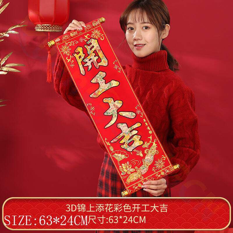Новогодние праздничные дети, которые фотографируют пару на сцене сцены, декоративная реквизита четыреххарактерная свиток, поздравляю Fa Cai Hanglian