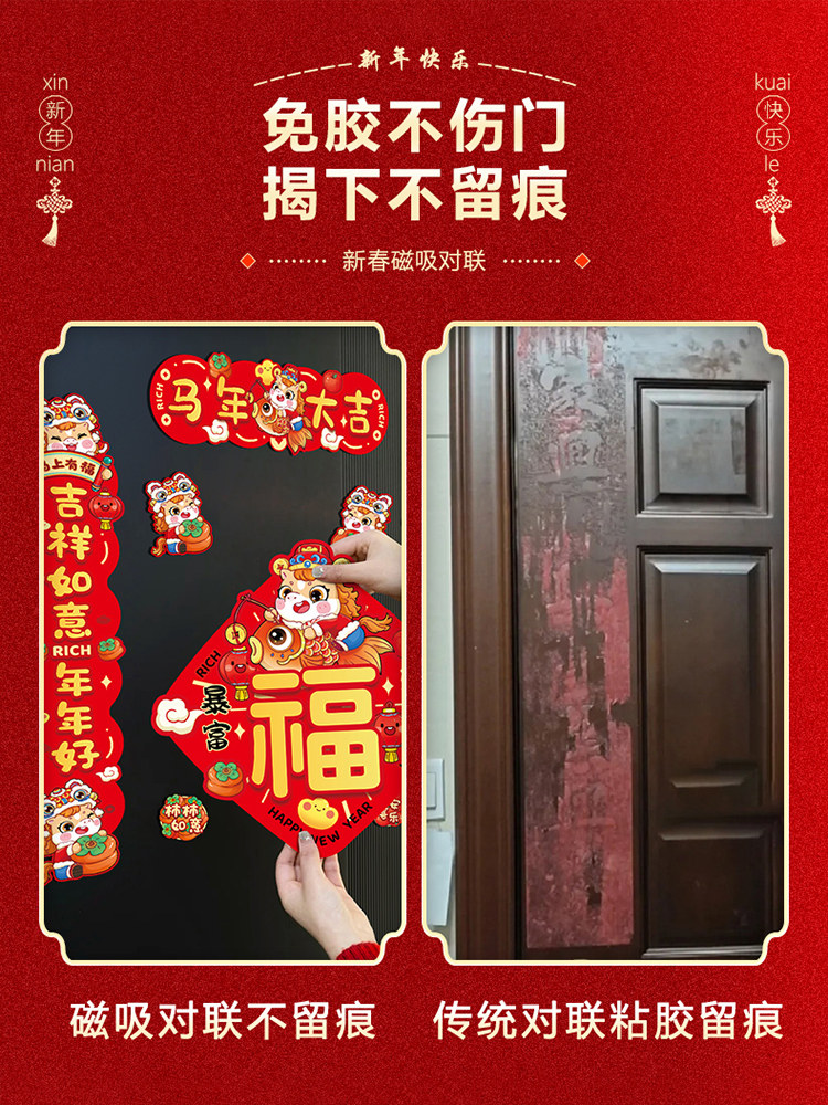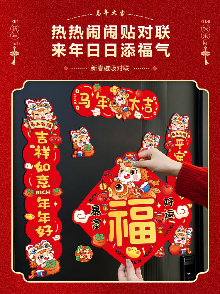 Год Лошади Магнитные куплеты 2026 Новый весенний фестиваль Куплеты со словом «Фу» в честь Нового года, Весеннего праздника, новогодних куплетов Бога богатства, дверных куплетов, украшений для входной двери