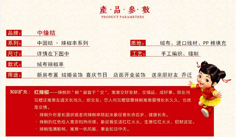 Ребенок в основном ярко -красный, с зелеными пуговицами, наполняет полный PP хлопок, носите его под тканым маленьким Китаем, чтобы каждый перецОни чрезвычайно яркие и яркие, и они очень рады повесить в комнату или дверь за всю комнату или дверь!
