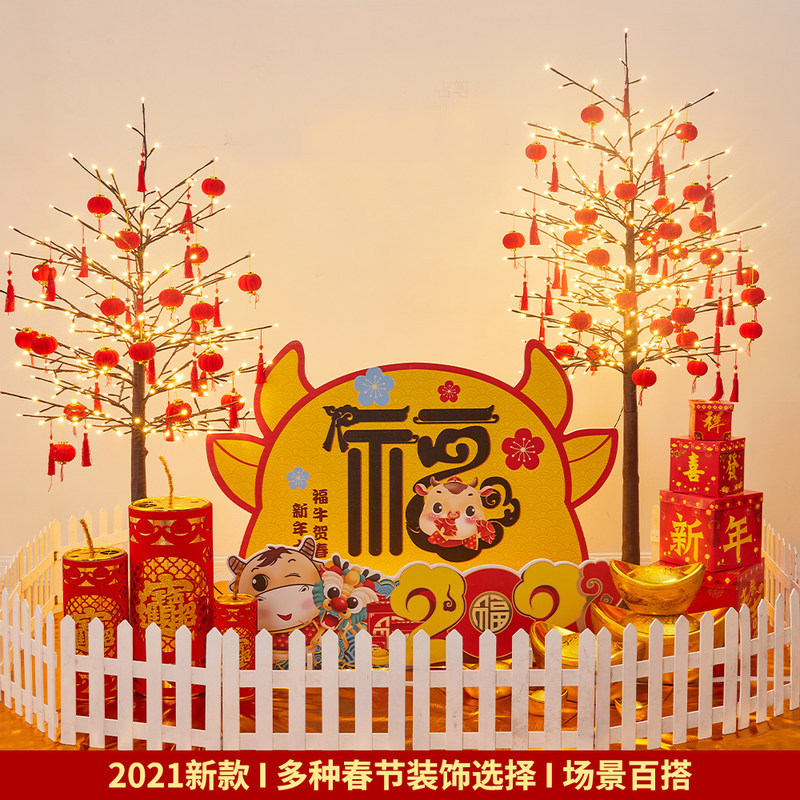 Новогодние украшения 2021 года, груды деревьев, блестящие волосы, план сцены большого торгового центра отеля, украшения и украшения Весеннего фестиваля.