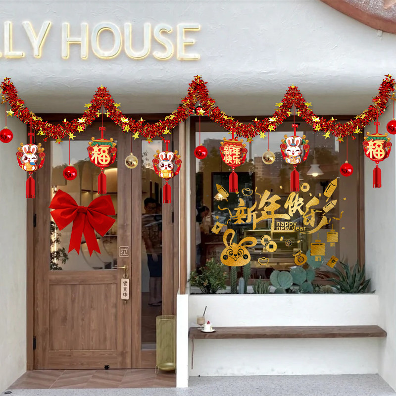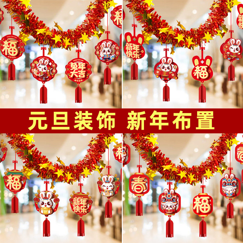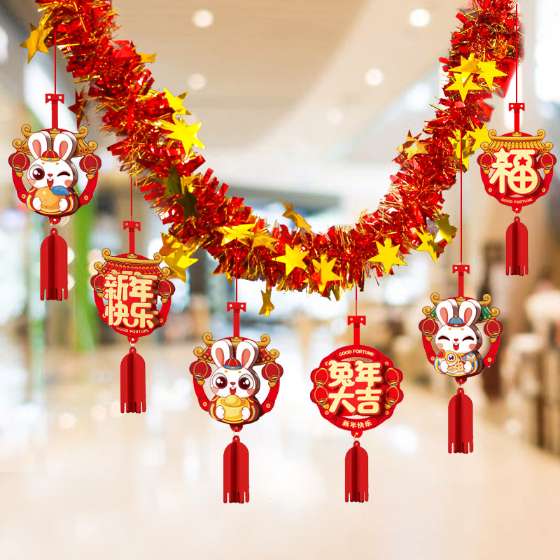 Новая годоватая атмосфера кроличьего года нового года, декоративные новогодние украшения, цветные полоски, отделка для украшения крана и аранжировка сцены цветочных баров.