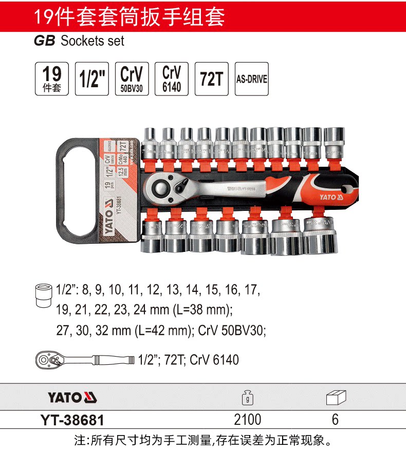 | Цвет: | 1/2 "19-пенсионный набор YT-38681, 1/2 "12-пексовый набор YT-38821 |