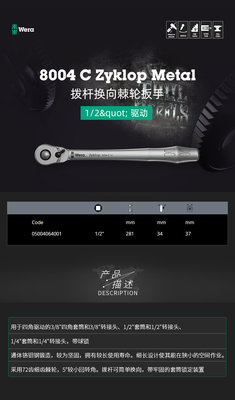 | Цвет: | 8004 Переключатель рычага на колючий диртук на колесах 1/4 "(05004004001), 8004 B TALC, чтобы переключиться на колючий колесный ключ 3/8 "(05004034001), 8004 C Рычаг к колюче на колесах 1/2 "(05004064001) |