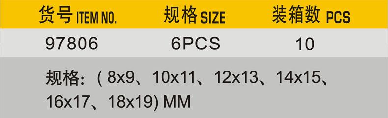 | Цвет: | 6-пекс набор подвижного двойного расцвета, 8*9mm 52521, 8*10mm 52522, 10*11mm 52523, 10*12mm 52524, 12*13mm 52525, 12*14mm 52526, 14*15mm 52527, 14*17mm 52528, 16*18mm 52529, 17*19mm 52530 |