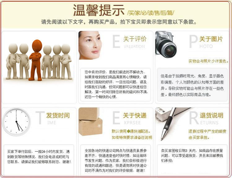 Следующие области не являются бесплатной доставкой:Гансу, Нинсия, Цинхай, Внутренняя Монголия, Хейлонгцзян, Синьцзян, Тибет. ![]() |