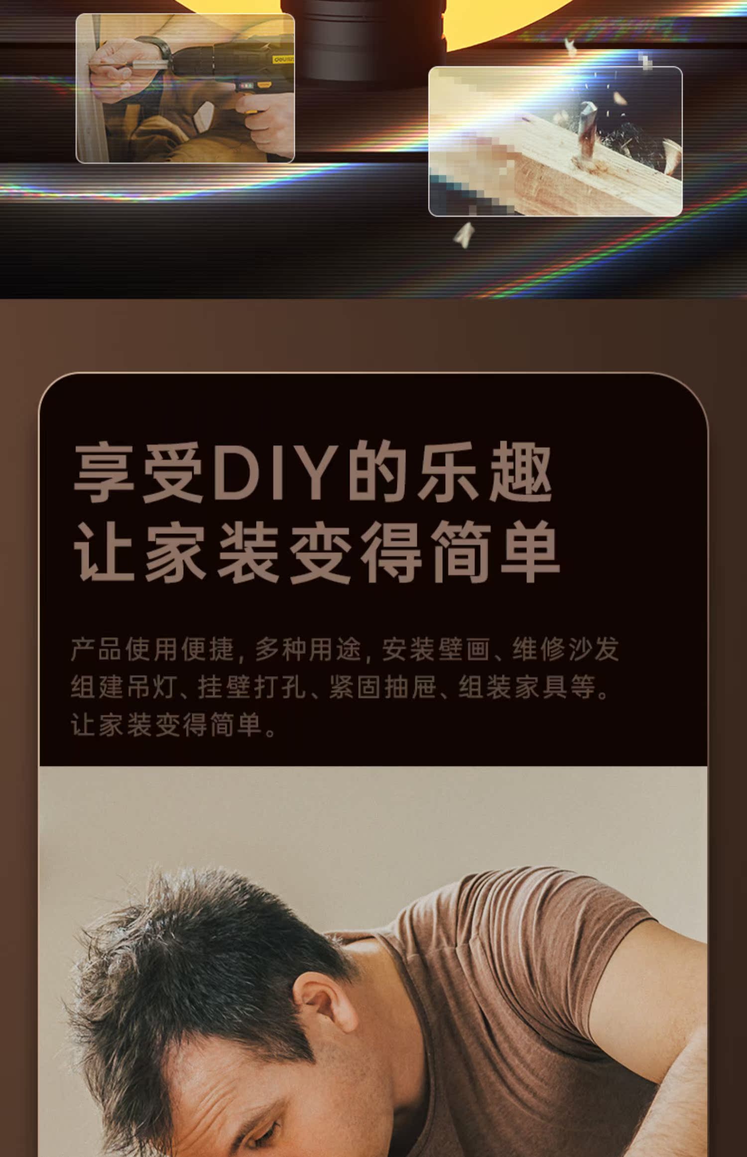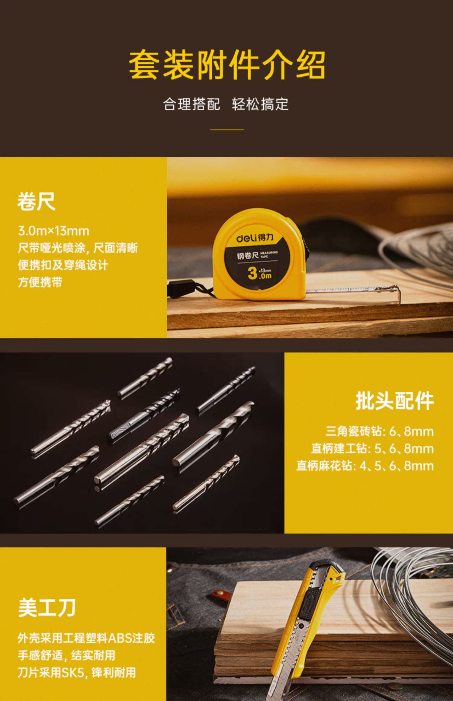 Электродрель, набор инструментов, универсальные столярные изделия