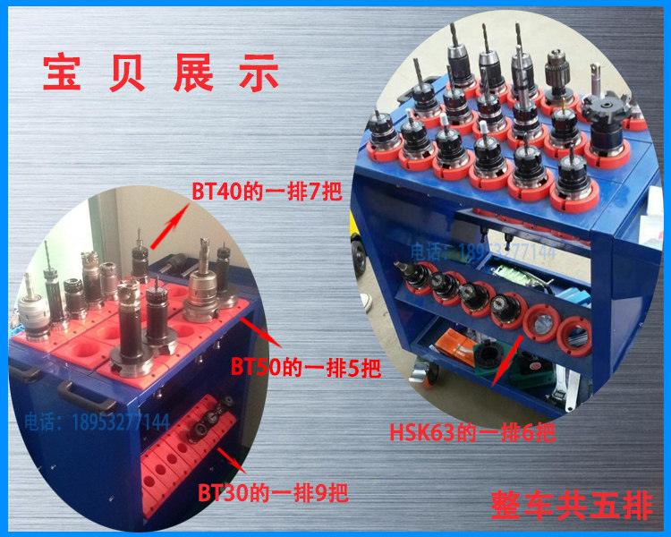 Эту тележку для инструментов можно собрать в соответствии с вашими реальными потребностями. В трех верхних рядах держателей инструментов можно разместить 27 инструментов BT30, 21 инструмент BT40 и 15 инструментов BT50.