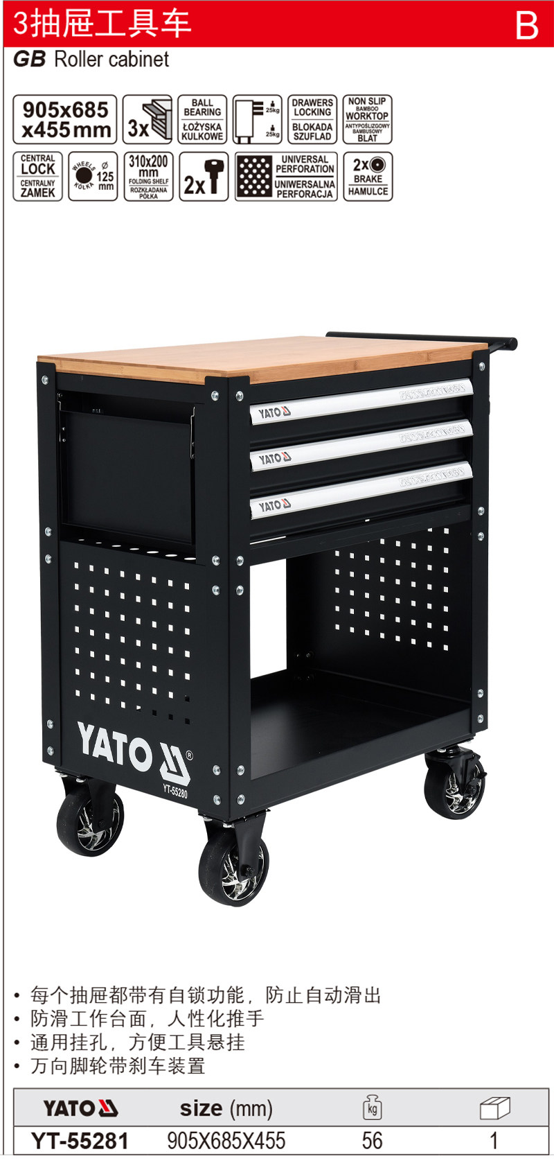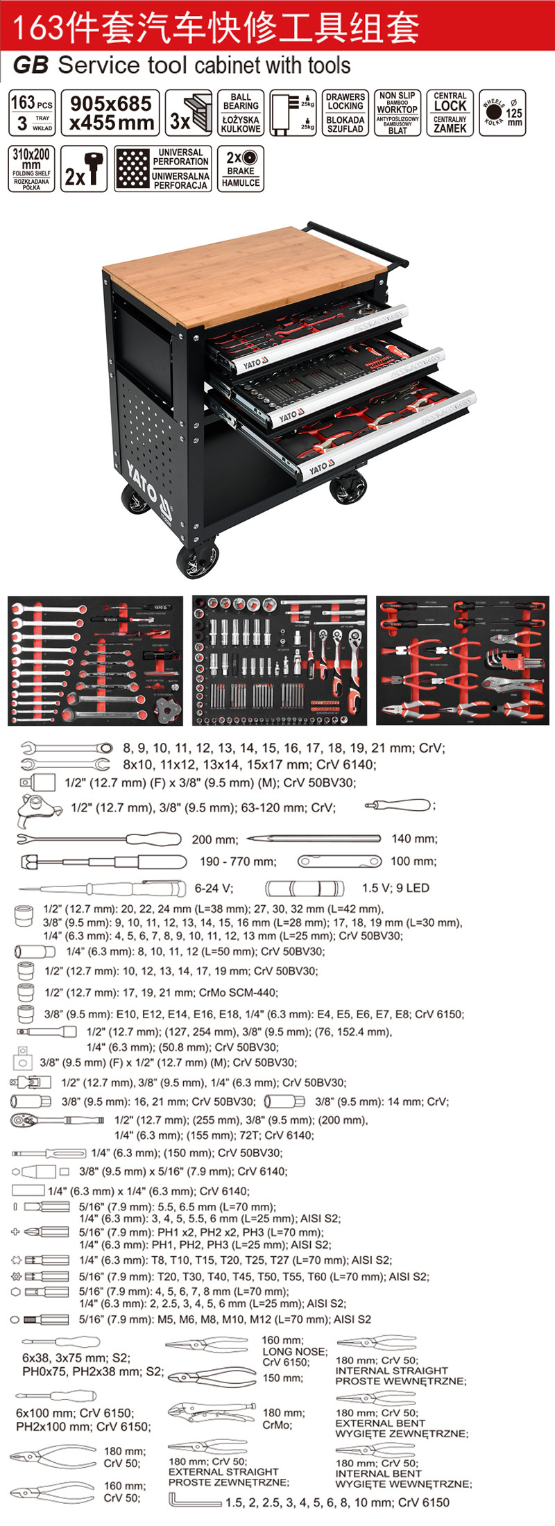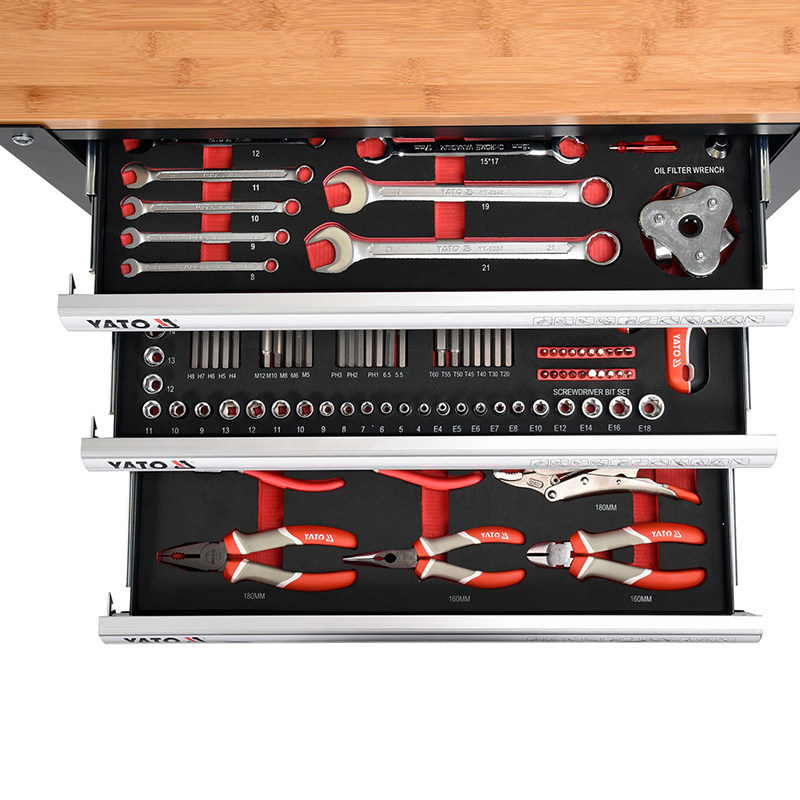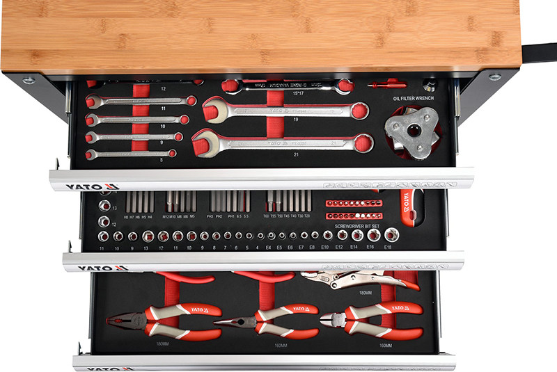 | Цвет: | YT-55280 (набор инструментов из 163 предметов), YT-55281 (тележка для инструментов с 3 ящиками) |