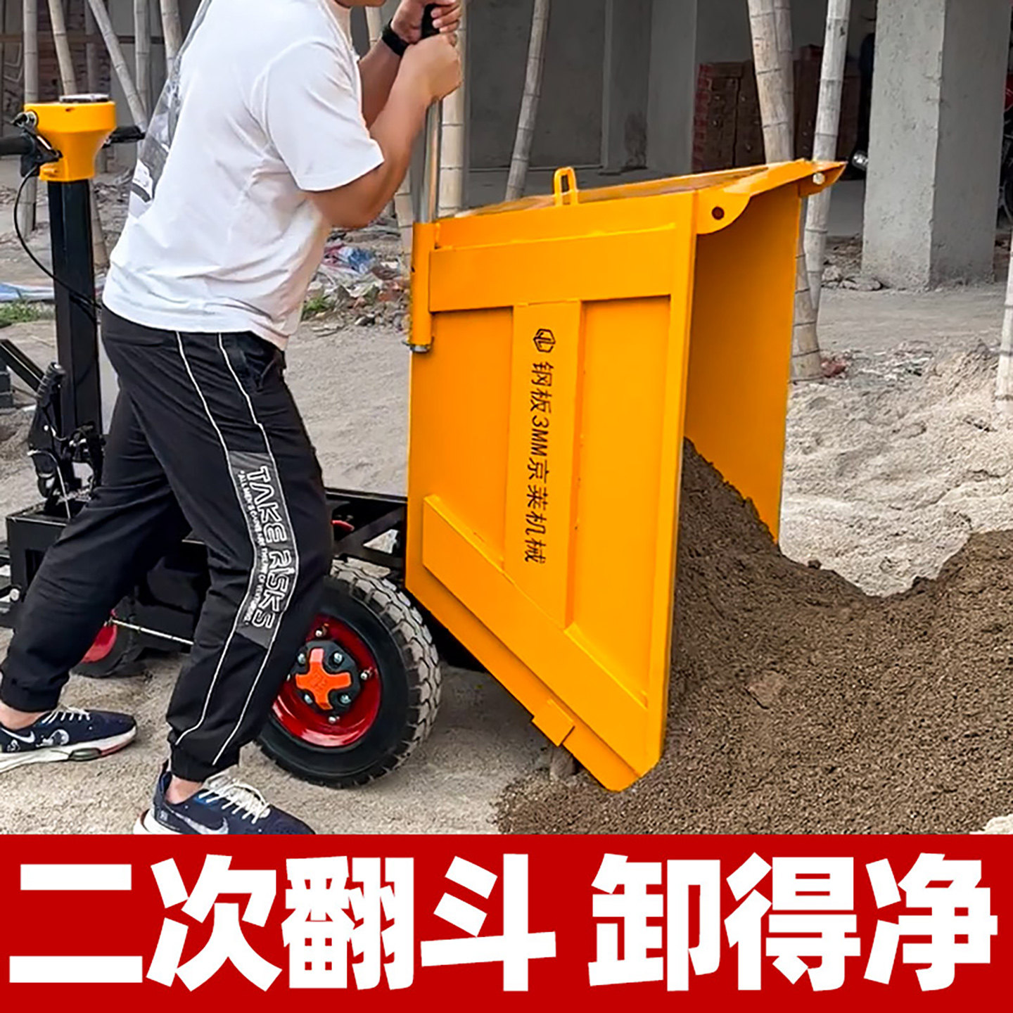 Электрическая корзина, перевернутая на строительную площадку с серым ковшом.
