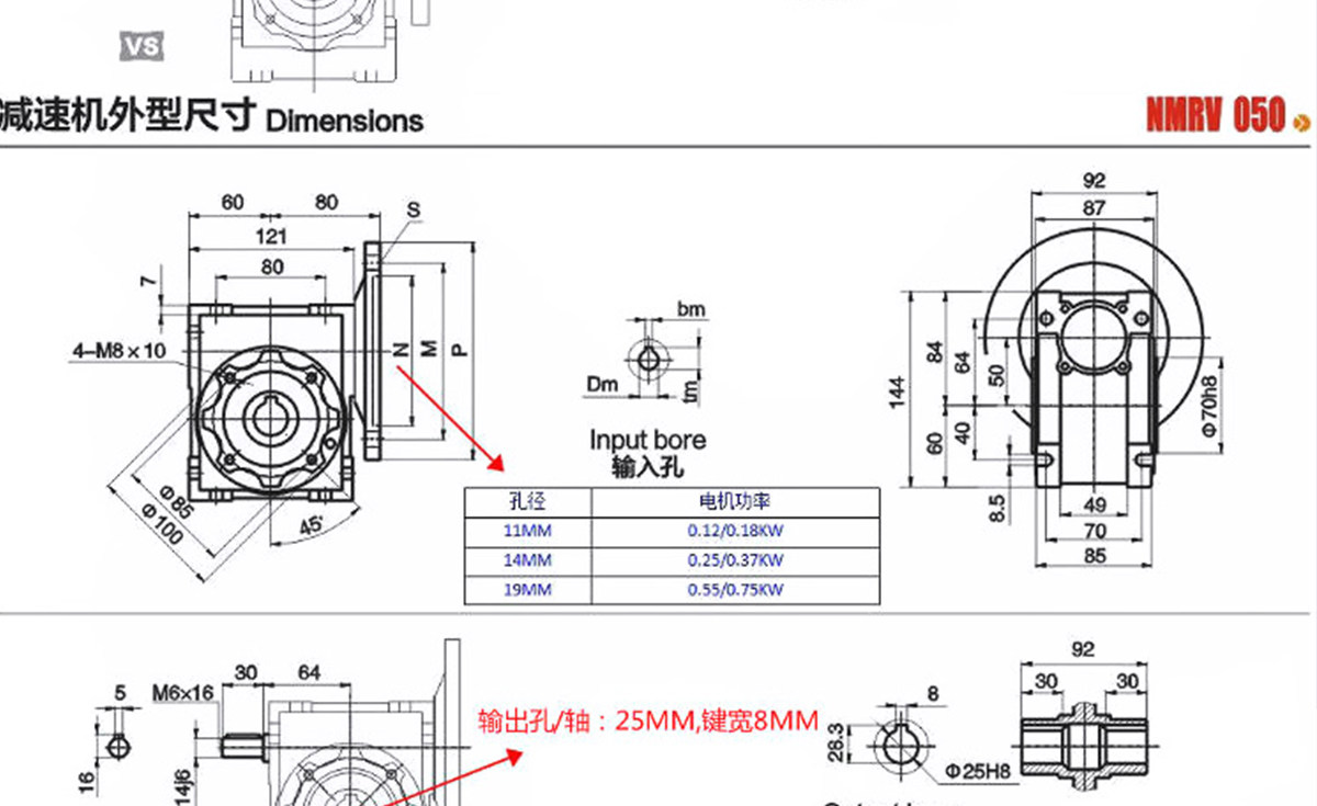 - NMRV025, выходное отверстие для вала 11