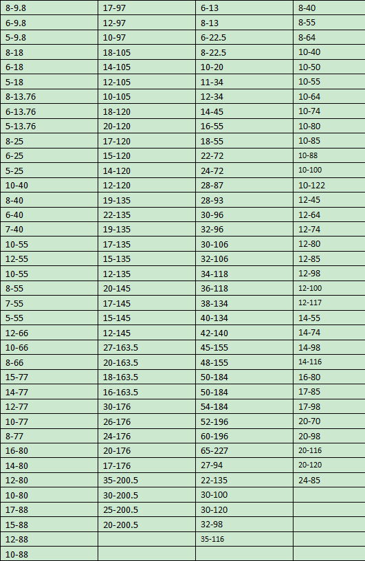 Размеры, продаваемые в этом магазине, следующие: