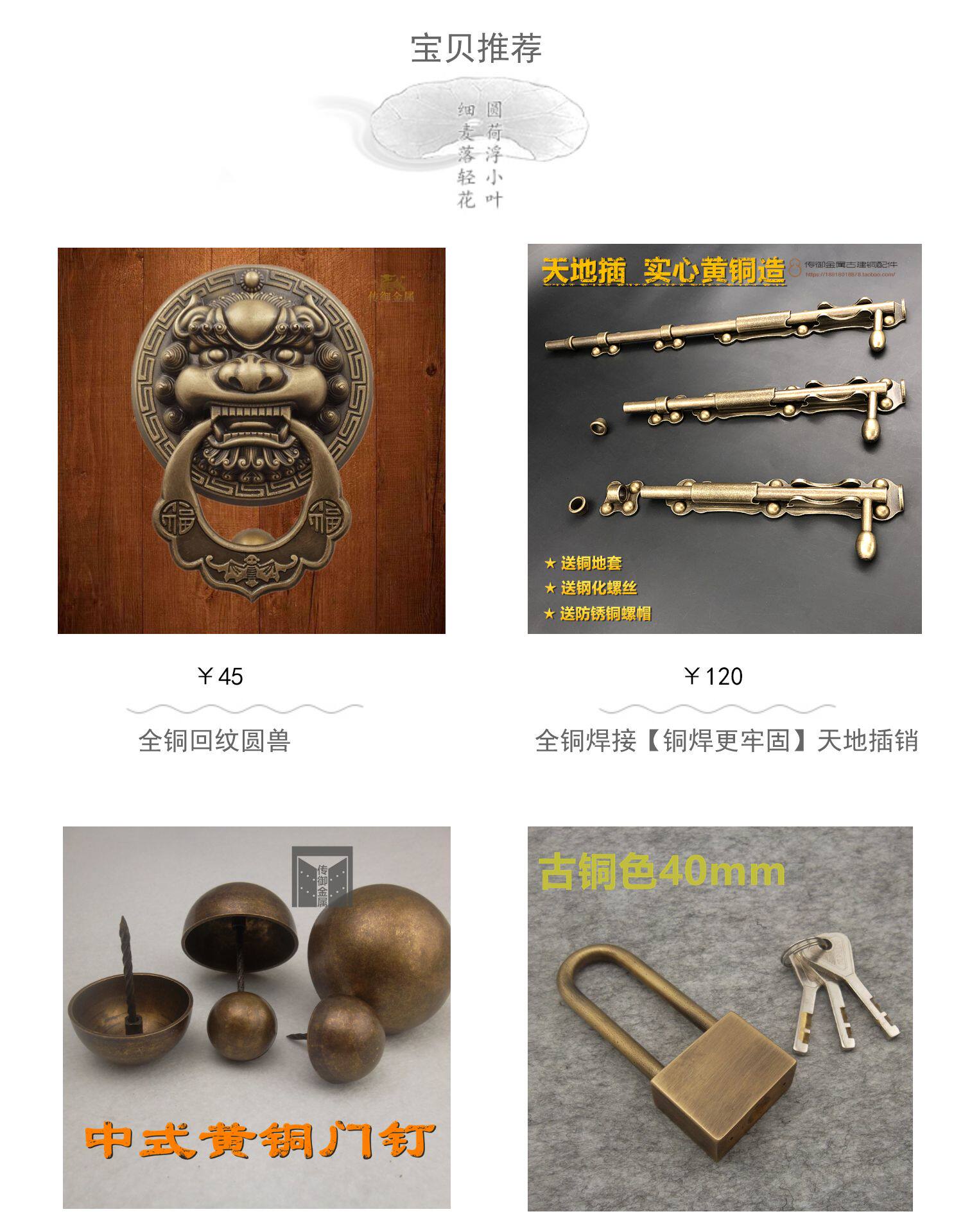 Продавец:传御古建铜配件企业店仿古实木门窗纯铜兽头门环铜钉批发