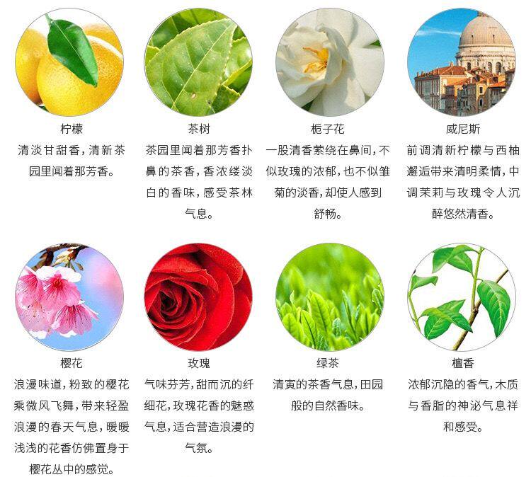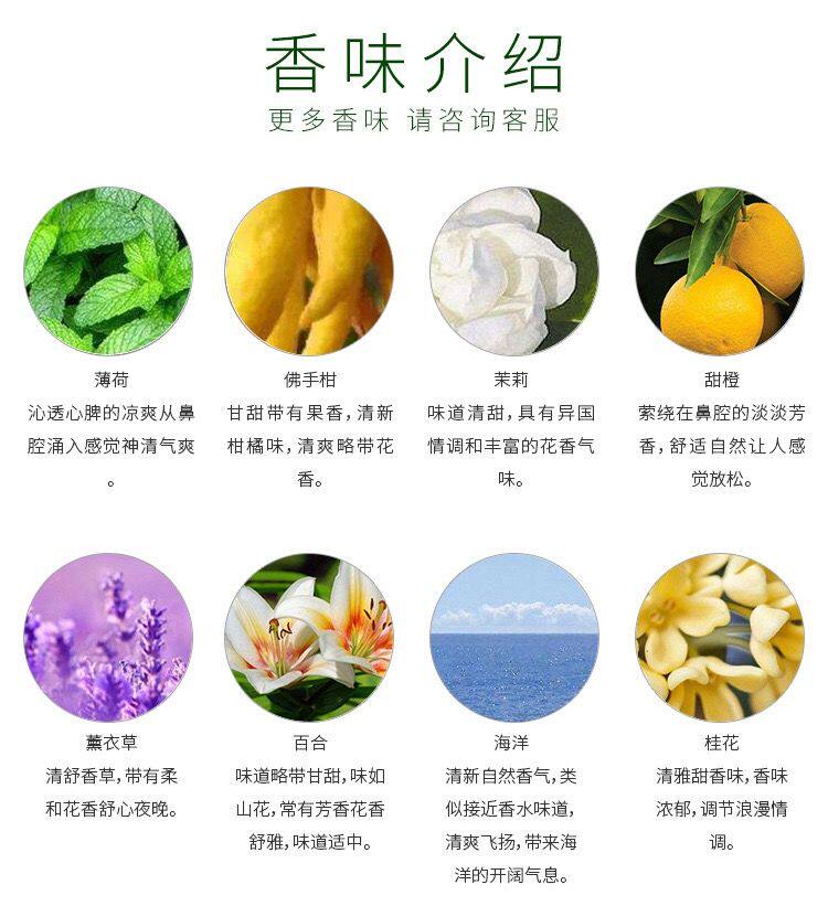 | Аромат: | Лаванда (предпочтительный сон), Роза и роза (романтические и теплые сеансы, Лили (свежее и элегантное настроение релаксации), Жасмин (мягкий и свежий удаление запаха), Встреча (Циня очарована и ароматна), Osmanthus (аромат, переполненный осенний вкус), Lemon Lemongrass (репеллент комаров немного прохладный), Британская груша Канглан (полная комната Youxiang British Wind) |