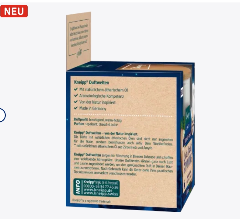 Ночь в мире аромата Knip -это время, настроение Матрис Амирис успокаивающий, теплый и древесный аромат вдохновения происходит от природы, создавая расслабленную атмосферу.Аромат натурального масла не только приятен, но и активно влияет на ваше здоровье.После использования из -за практической крышки свеча может быть снова закрыта ароматическим образом. Пожалуйста, обрати внимание: Свеча должна быть погашена перед сном!Пожарный риск!Не заказывайте свечи на поврежденном стекле.Не позволяйте нашим свечам полностью гореть, чтобы избежать разрыва стакана. Kneipp®Мир аромата создает атмосферу и успокаивающую атмосферу для вашего дома.Наша ароматическая свеча можно воспламенить в соответствии с вашим настроением, создавая нужный аромат для вашей комнаты Выражать.После использования из -за практической крышки свеча может быть снова закрыта ароматическим образом. Поместите, где дети не могут связаться.Прочитайте все описания и следуйте им.Не обращайтесь с содержанием/контейнером и домашним мусором и обрабатываются в соответствии с региональными/национальными правилами.