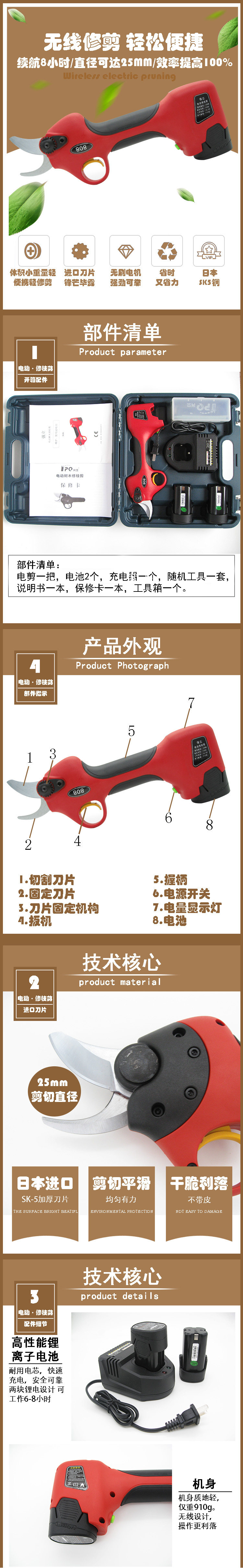 Машина обрезки фруктового дерева среднего размера среднего размера:1950Юань (со средней литийной батареей может работать непрерывно8-10Часы)