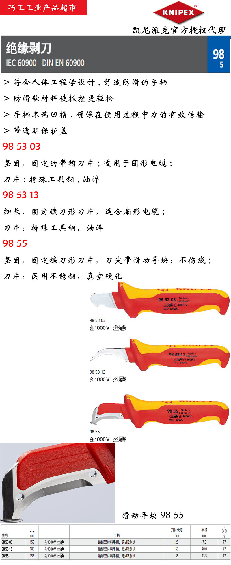 Knipex German Keni Pike Импортированное электрическое изоляционное кабельное кабель 9855 Серповой крюк Нож 98 55