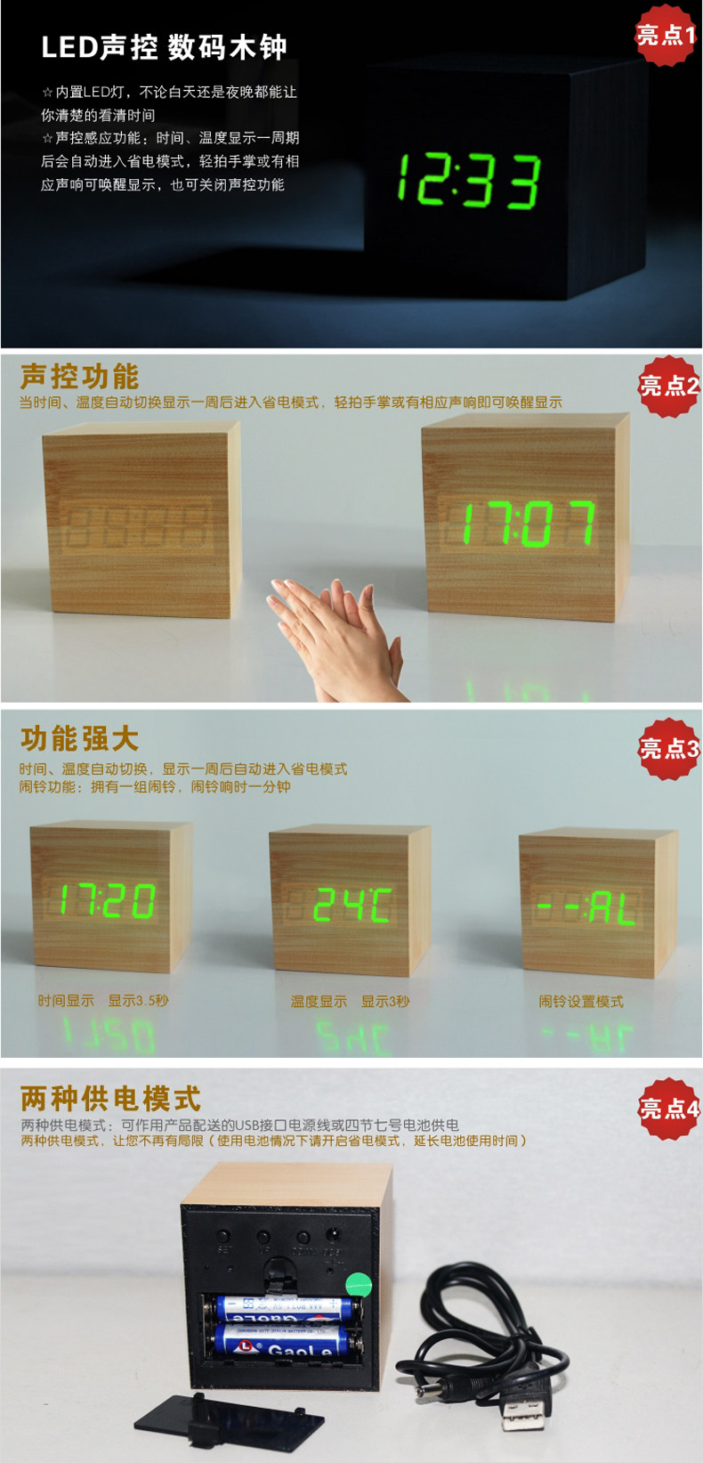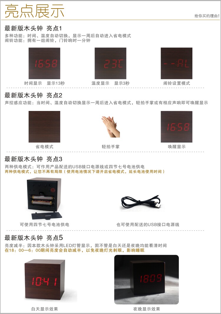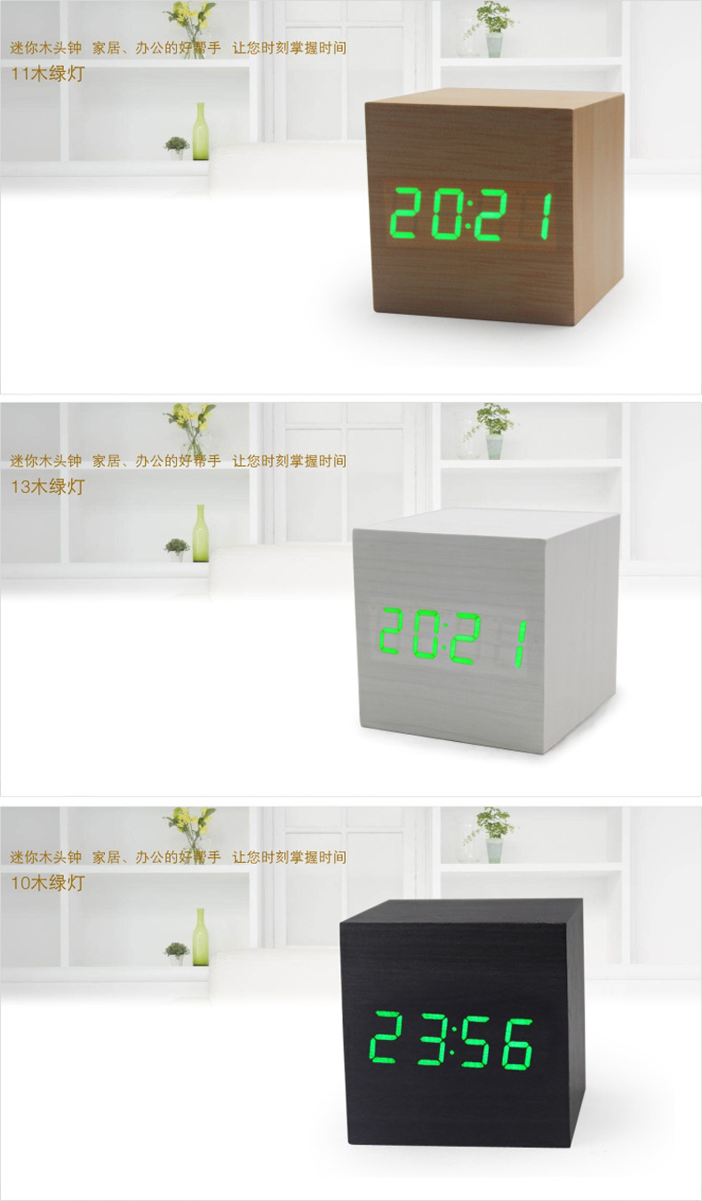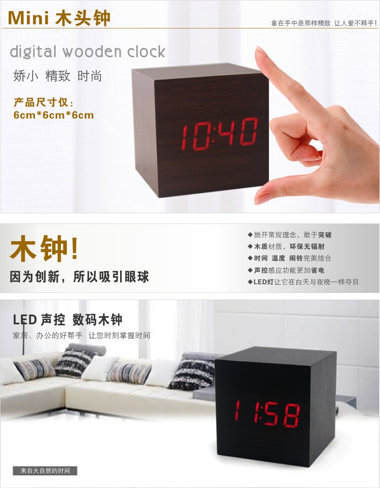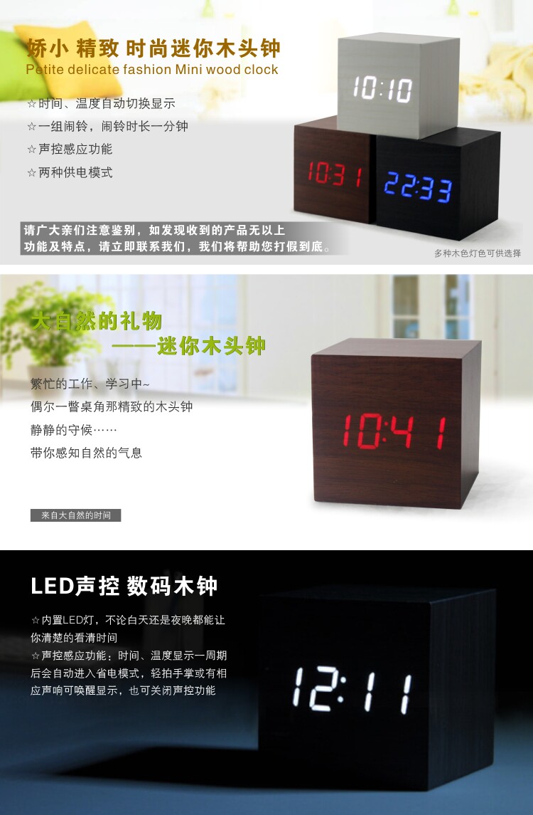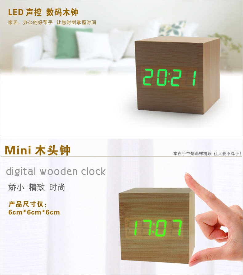 Подлинные светодиодные деревянные часы мода творческие ленивые будильники светящиеся будильники управление звуком звука Электронные часы мини -столовые часы