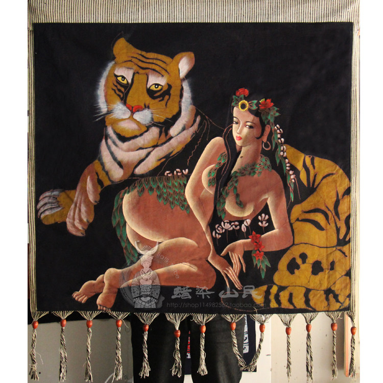 10 -Year -Sold Wax Dyeing Tiger и Beautiful Girl Hotel Inn, декоративная роспись ручной ткани 94*90 см.