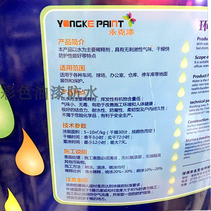 Yongke Экологически чистая краска на пола на водяной основе: цементный пол высокого цвета (без влаги, без масляных пятен, без пыли): Шаг 1: Сначала почистите грунтовку, шаг 2: Смажьте верхнее пальто после сушки, и шаг 3: Увеличьте глянец и почистите лак.
