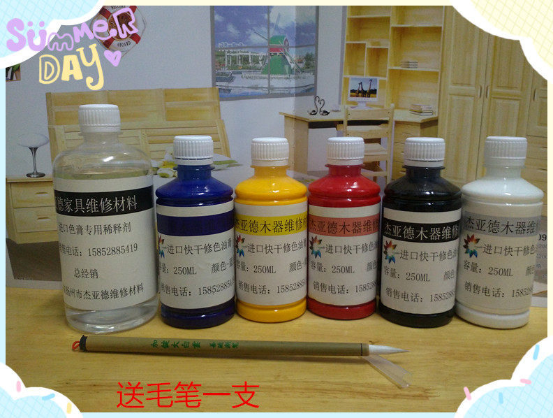 Использование; Кратко усугубляющая цветовая мазь имеет 6 основных цветов: красный, желтый, белый, черный, синий, красная и коричневая одна бутылка разбавителя   Инструкции по сопоставлению цвета;   1. Найдите прозрачную пустую чашку.Добавьте соответствующее количество разбавителя. Затем посмотрите, какой цвет вы настраиваете, чтобы выбрать относительный крем для пропорции   2. Мебель с текстурированным древесным зерном должна быть добавлена в цветную сущность, чтобы она была прозрачной   3. Цветная мебель не требует раскраски сущности   4. После регулировки цвета используйте большую щетку, чтобы чистить цвет   5. Добавить фен при окрашивании  Верный удар, пока 6.  После коррекции цвета, спрей для поверхностного слияния