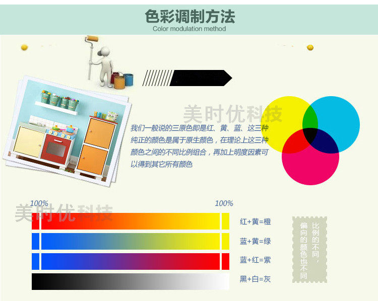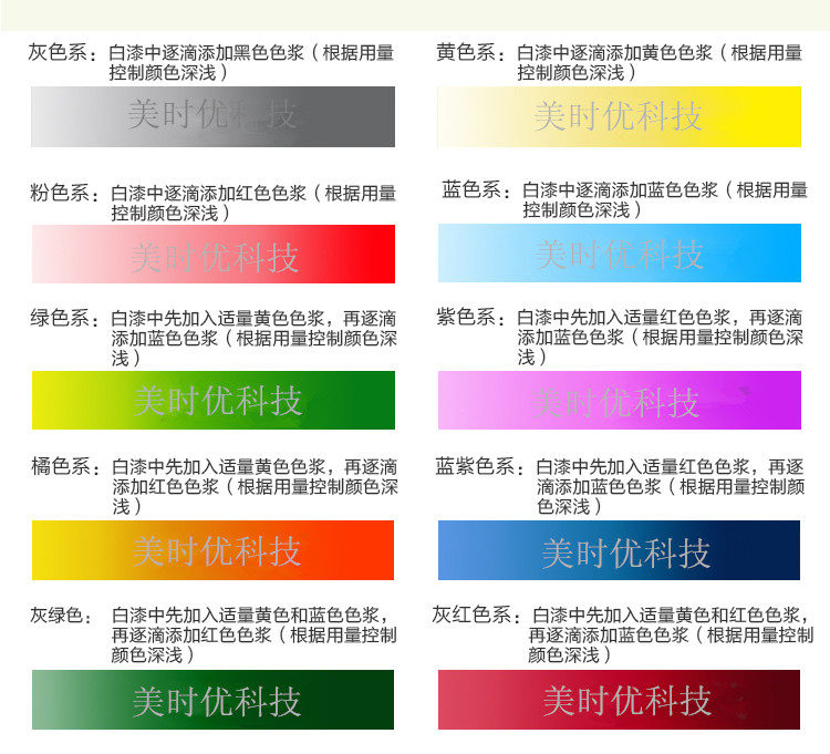 1. Смешивание цветов непрозрачных цветных грунтовок, цветных финишных покрытий и других однотонных красок.Например, краска для шкафа, детская краска и т. д.