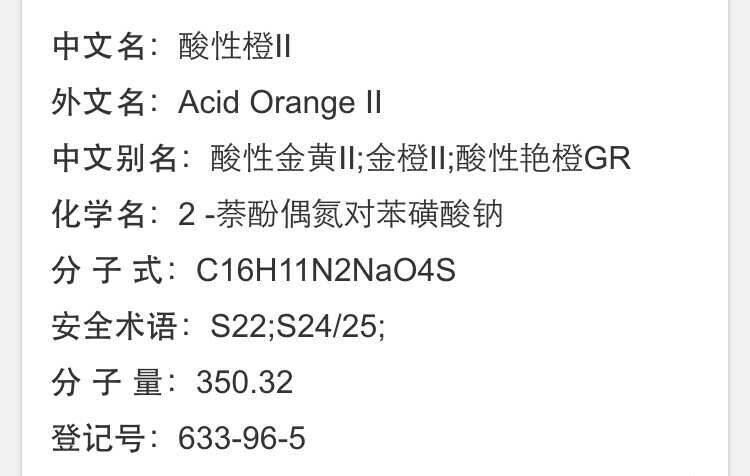 Индустрия в основном используется в шерстяном, коже, шелковом, нейлоне и бумажной окрашивании.В то же время, это также индикатор, который часто используется для нарезанного тканей красителем.В пищевой промышленности Lide Orange II -это неправданый пигмент, и запрещено присоединиться к пище.Золотой порошок, растворимый красным светом и желтым, растворим в этаноле и оранжевом.Его водный раствор добавляет коричневое осаждение с гидрохловой кислотой, а гидроксид натрия темно -коричневый.