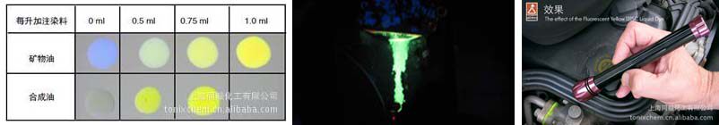 Это применение требует добавления флуоресцентного агента в моторное масло, топливо, гидравлическое масло и другие нефтяные продукты, а затем облученным высокоинтенсивным черным светом (невидимый ультрафиолетовый или инфракрасный), краситель будет иметь сильную желто-белую флуоресценцию, а утечка будет легко обнаружена. Эту флуоресценцию можно легко отличить от натуральной синей флуоресценции некоторых масляных продуктов.