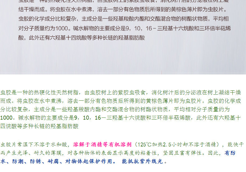 Клей насекомых - это своего рода затвердевающая натуральная смоля.Желтые тонкие тонкие срезы, полученные после растворения части цветных веществ, варят в воде.Химический состав клея насекомых относительно сложный. Основными ингредиентами являются вещества в форме эфира деревьев некоторых гидроксиловых карбоновых кислот гликол карбоновой кислоты со средней относительной молекулярной массой около 1000.Основными компонентами щелочного гидролиза являются 9,10,16 -триантовая кислота и треугольная циклональная кислота. Кроме того, существует много длинных гидроксиловых кислот, таких как гексарий гидроксиновые кислоты