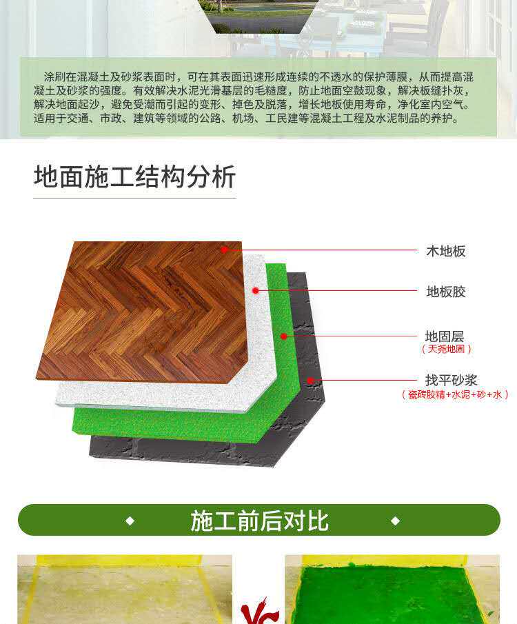 2. Он подходит для упрочнения цементного пола на ранних стадиях украшения. Он может эффективно избегать частиц пыли цементного пола на рабочей поверхности во время последующего процесса строительства, тем самым улучшая качество партии и покраски латексная краска.